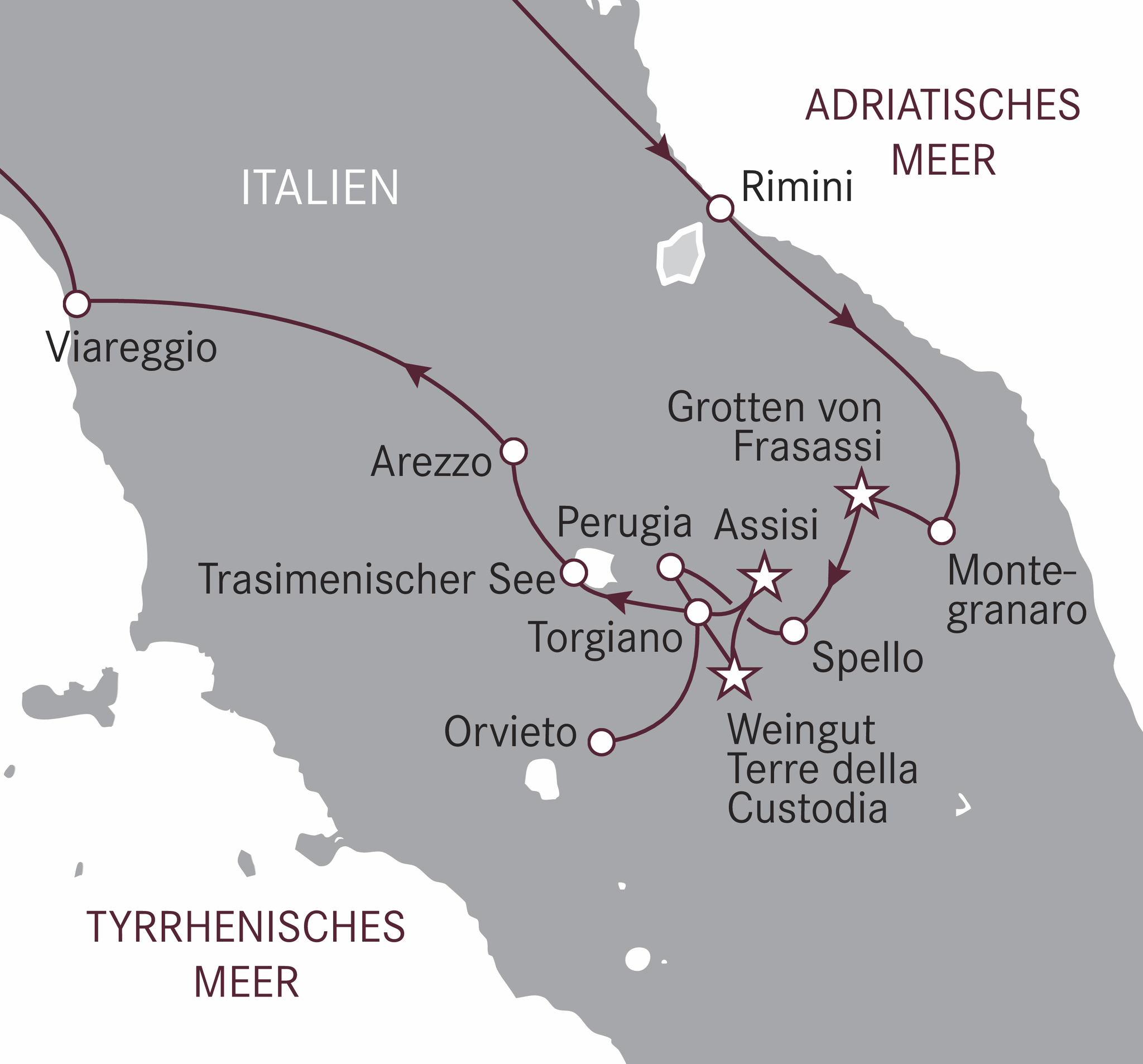 Sie besichtigen die imposanten Grotten von Frasassi. Direkt unter dem Naturpark der "Gola della Rossa" befindet sich mit den Grotte di Frasassi ein einzigartiges Höhlensystem, welches Regenwasser in das Gestein gegraben hat. Die aufregende Welt unter der Erde durchschlängelt ein 1.500 Meter langer Weg, auf dem man von der Natur geschaffene Räume, tiefe Abgründe und Seen passiert. Dank der künstlichen Beleuchtung fühlen Sie sich fast wie in eine Märchenwelt voller Magie versetzt. Später lernen Sie die Sehenswürdigkeiten des beliebten Pilgerortes Assisi kennen. Sie sehen u.a. die Basilika von San Francesco mit ihrer imposanten Architektur und den von den besten Künstlern angefertigten Fresken. Im Weingut Lungarotti werden Sie zu einem exquisiten Abendessen mit Weinbegleitung erwartet. (3 Nächte im Hotel Posta Donini 1579****).