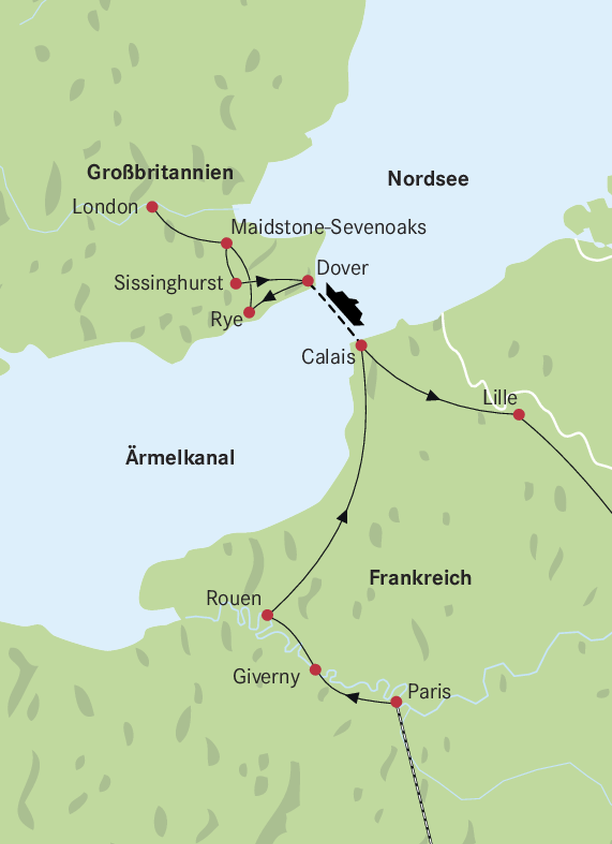4. Tag: SissinghurstZum Abschluss der Reise besuchen Sie das wunderbare Anwesen von Sissinghurst. Durch Hecken und Mauern entstanden Themengärten mit viel Atmosphäre, wie der legendäre Rosengarten oder der weisse Garten. Der Garten wurde von Vita Sackville-West entworfen und ist bis heute im Geiste ihrer Philosophie erhalten geblieben. Via Dover und Fährpassage nach Calais erreichen Sie das nordfranzösische Lille. Das Abendessen nehmen Sie auf der Fähre ein. Übernachtung im 4-Sterne-Hotel Mercure Lille Marq en Baroeul.