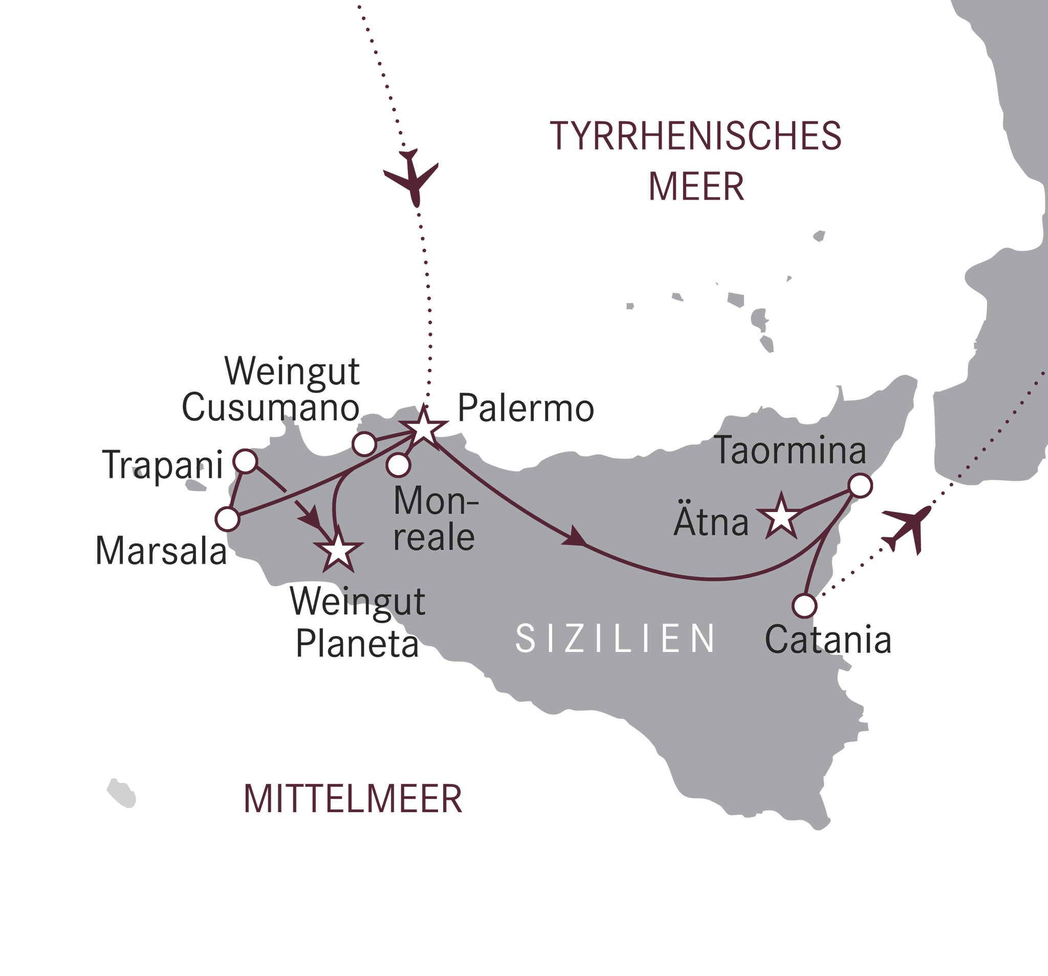 Erleben Sie die Kulinarik Siziliens, welche von den lebhaften Märkten Palermos getragen wird. Die filigranen Weine, die auf den mineralreichen Böden des Ätnas gedeihen, runden die geschmackliche Vielvalt dieser historischen Insel perfekt ab. Die malerische Salzstrasse und die historische Windmühlen begeistern an der Westküste.