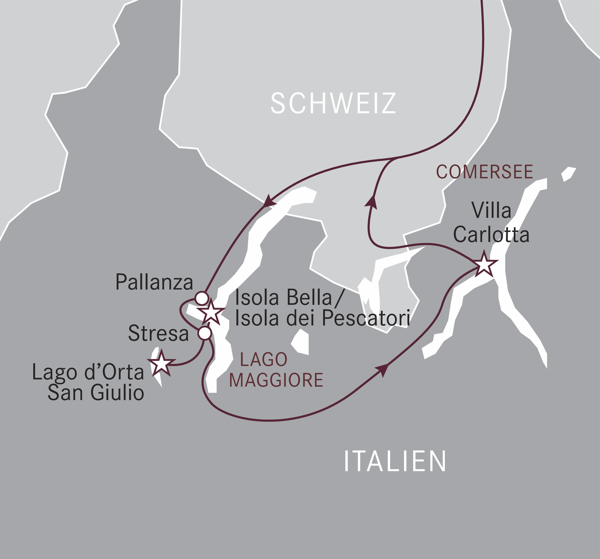 Ihre Reise führt Sie über die Alpen an den Lago Maggiore, wo der See mit seiner Weite, den Palmen und prächtigen Villen mediterranes Lebensgefühl verströmt. In Pallanza, einem der elegantesten Orte am Lago Maggiore, geniessen Sie einen Spaziergang und ein individuelles Mittagessen. Am Nachmittag erreichen Sie Stresa, die piemontesische Perle des Lago Maggiore. Im traditionsreichen Grand Hotel des Iles Borromées, beziehen Sie Ihre Zimmer und lassen den Tag bei einem gemeinsamen Abendessen stilvoll ausklingen.