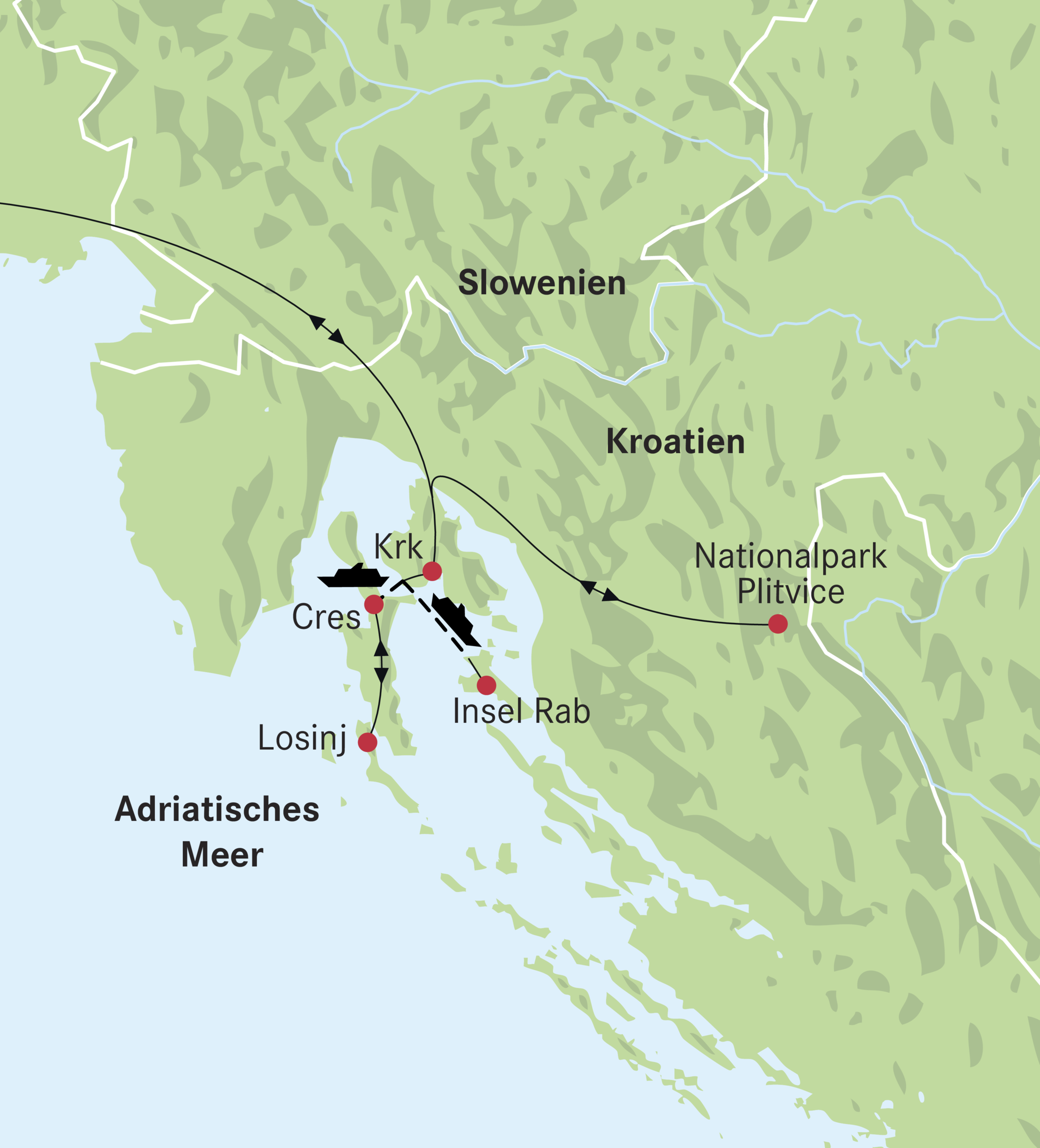 Krk, Losinj, Cres und Rab, vier Inseln mit ganz unterschiedlichem Charakter. Geniessen Sie auf dieser Busreise die faszinierende Vielfalt der Inselwelt Kroatiens und erleben Sie den einzigartigen Zauber von Wasser, Stein und Meer.