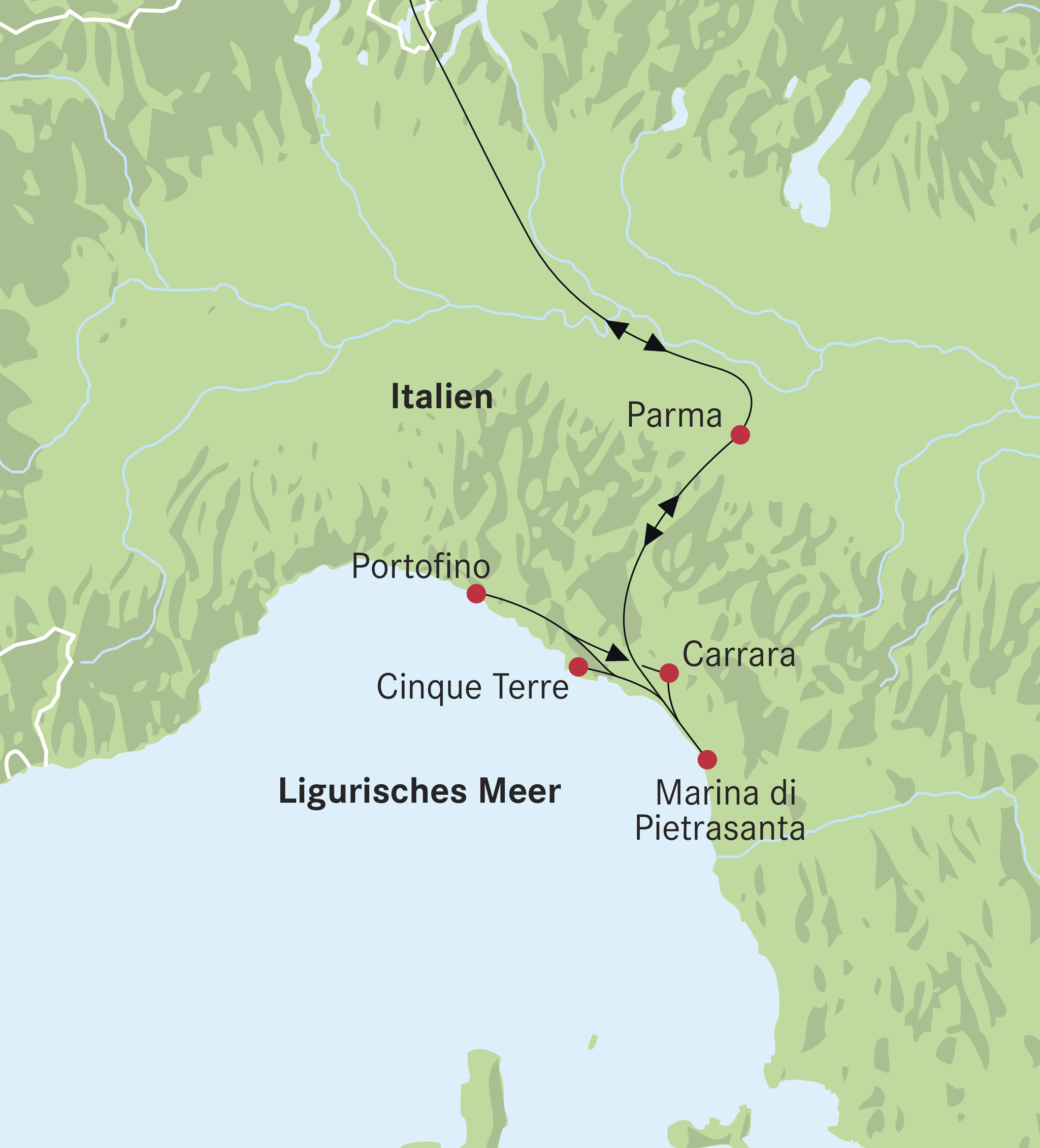 Fünf pittoreske und autofreie Dörfchen mit malerischen Häfen und dramatischen Klippen bilden die berühmte Cinque Terre. Diese grandiose Landschaft mit ihren Olivenhainen und zerklüfteten Küsten erkunden Sie per Schiff und zu Fuss. Sie besuchen die weltbekannten Marmorsteinbrüche von Carrara und unternehmen eine Bootsfahrt der Küste entlang zur Halbinsel Portofino.
