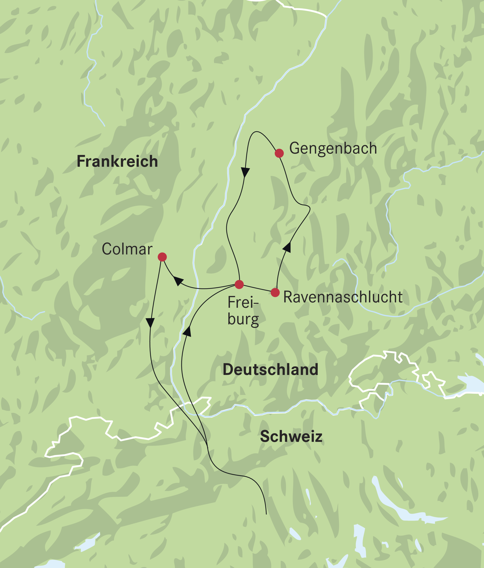 Unter dem 40 Meter hohen Eisenbahn-Viadukt der Höllentalbahn spüren Sie die geheimnisvolle Atmosphäre des wildromantischen Weihnachtsmarktes in der Ravennaschlucht. In Freiburg im Breisgau kommt das Shopping-Erlebnis nicht zu kurz und auch der Weihnachtsmarkt vor dem Münster lässt keine Wünsche offen. Bei einer Schwarzwald-Rundfahrt erleben Sie Schwarzwäldische Traditionen und bestaunen das weltgrösste Adventskalenderhaus in Gengenbach. In Colmar verzaubern Sie die märchenhaften Weihnachtsmärkte mit elsässischen Spezialitäten.