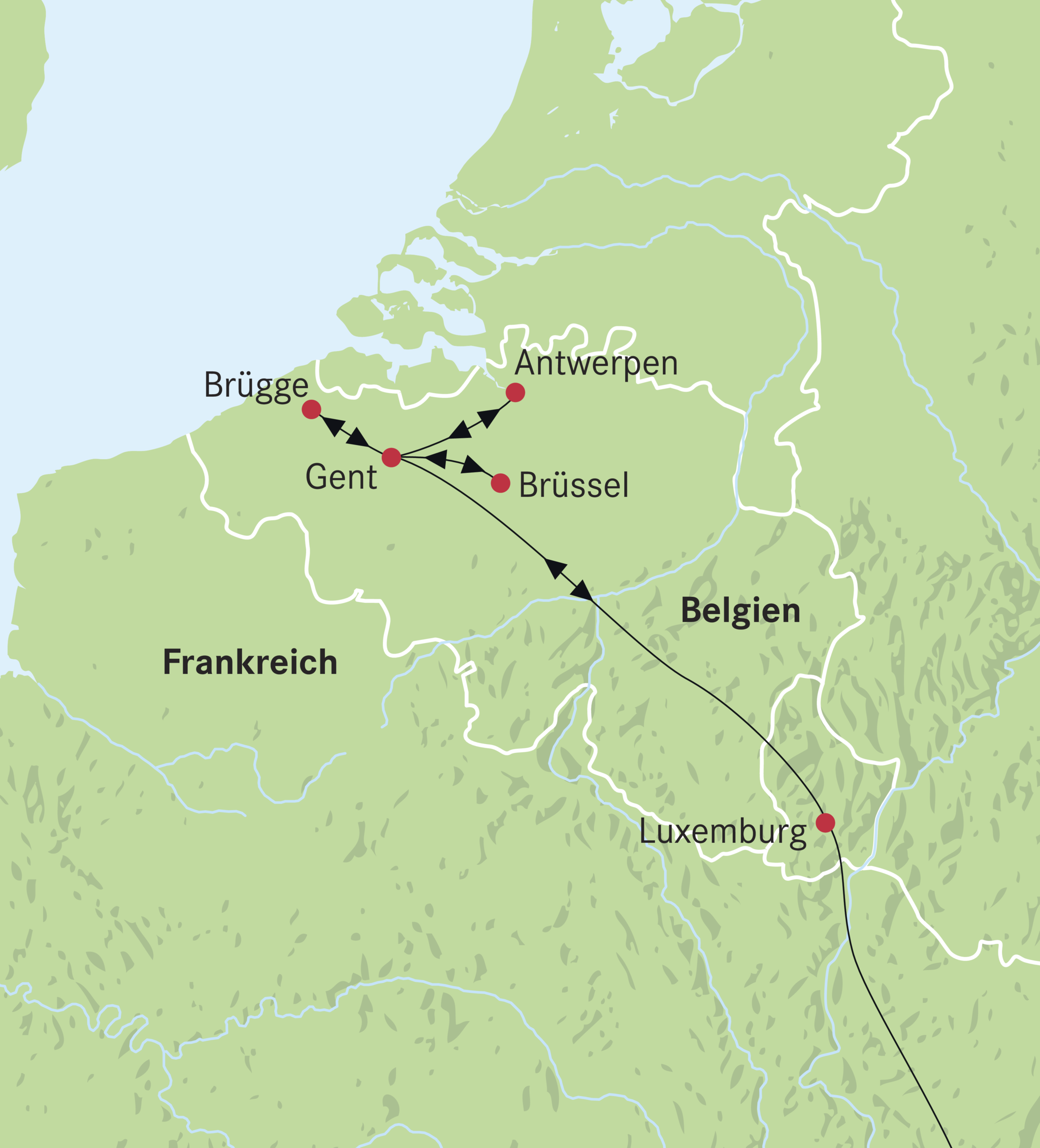 Reise via Basel nach Metz und durch Luxemburg nach Gent.