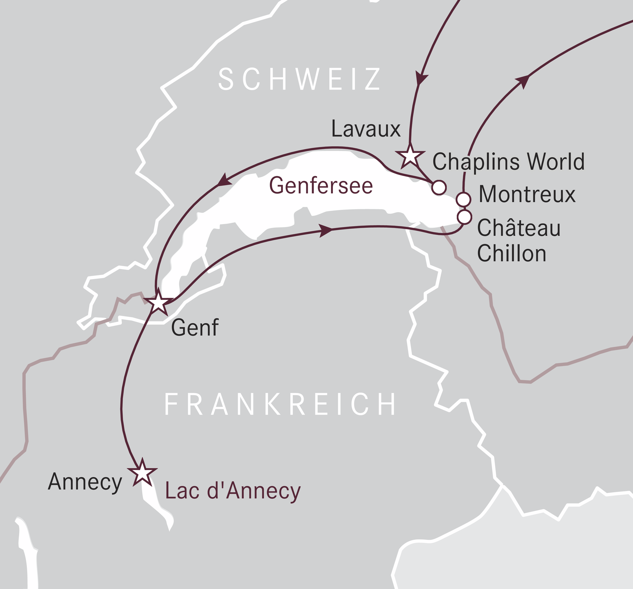 Geniessen Sie drei unvergessliche Tage am Genfersee und in der angrenzenden Haute-Savoie. Das UNESCO Welterbe Le Lavaux mit seinen Weinbergen in Terrassenform wird Sie genau so begeistern wie die packend nacherzählte Lebensgeschichte von Charlie Chaplin. Traumhafte Aussicht und Erlebnis-Gastronomie verführen Sie in Cologny.