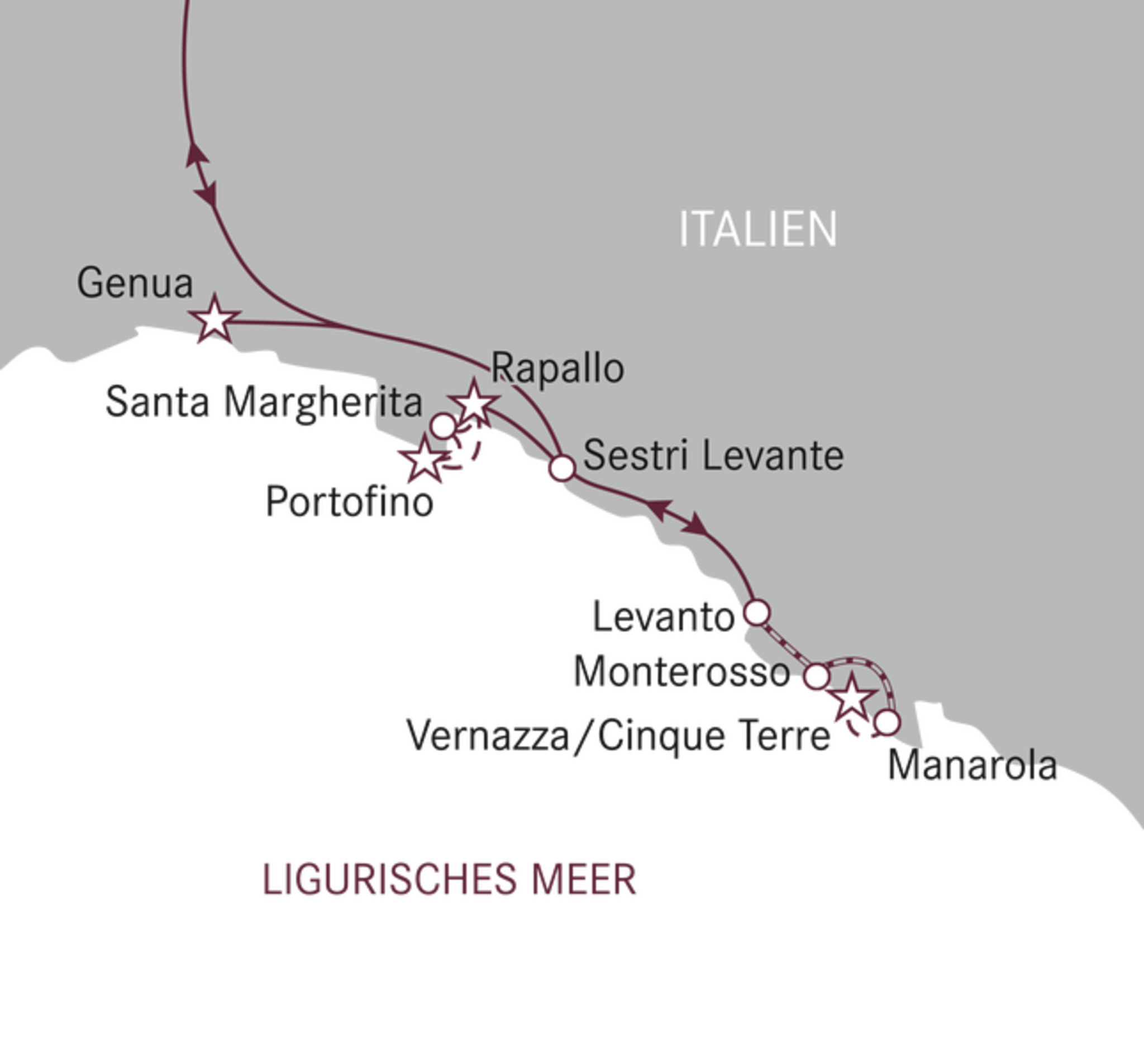 Heute widmen Sie sich den Dörfern der Cinque Terre, einem Küstenabschnitt von unvergleichlicher Schönheit. Wie bunte Würfel schmiegen sich die kleinen Orte an steile Felsen, dazwischen glitzert das Meer in allen Blautönen. Terrassenförmig steigen Weinberge die Hänge hinauf, schmale Gassen führen zu versteckten Plätzen und kleinen Kirchen. Jeder Ort hat seinen eigenen Charakter, doch alle teilen denselben Zauber: das Gefühl, am Ende der Welt und doch mitten im Leben zu sein. Bei einem eleganten Abendessen im Hotel klingt der Tag in stimmungsvoller Atmosphäre aus.