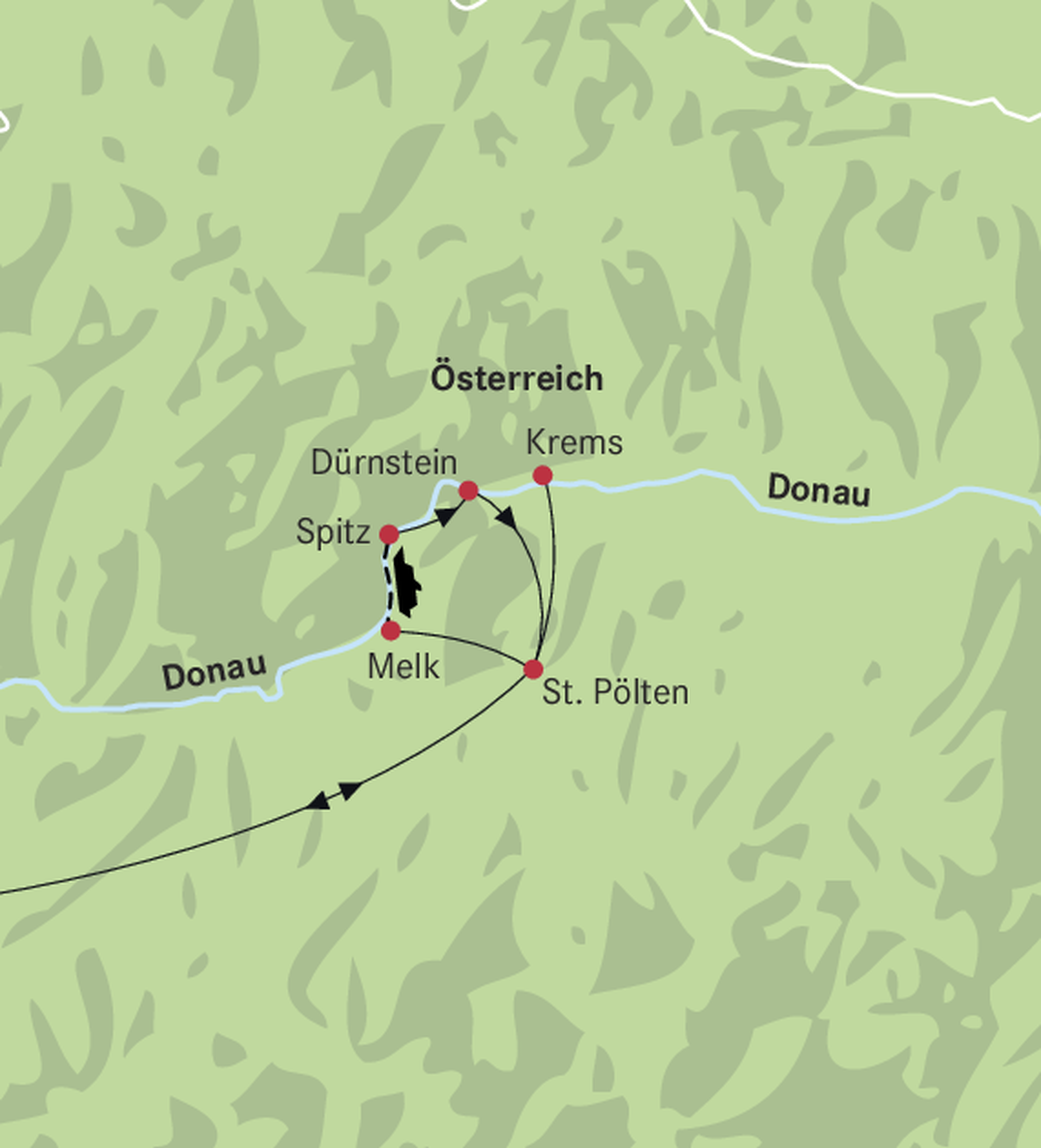 Fak. Ausflug: Sie besichtigen das Stift Melk, das grösste und schönste Barockkloster Österreichs. Das Stift birgt unzählige Kunstschätze: Die reich ausgestattete Stiftskirche, das schöne Kaiserzimmer, den Marmorsaal und die berühmte Bibliothek mit 80'000 wertvollen, alten Büchern. Von der Aussichtsterrasse geniessen Sie einen herrlichen Blick vom Alpenvorland bis ins Waldviertel. Sie haben Zeit für einen Bummel durch die Altstadt von Melk. Teile der Stadt, wie auch das Stift Melk, gehören zum UNESCO-Weltkulturerbe. Am Nachmittag erwartet Sie eine Schifffahrt von Krems bis nach Spitz. Sie gleiten an Städtchen, Marillengärten und Weinterrassen vorbei.