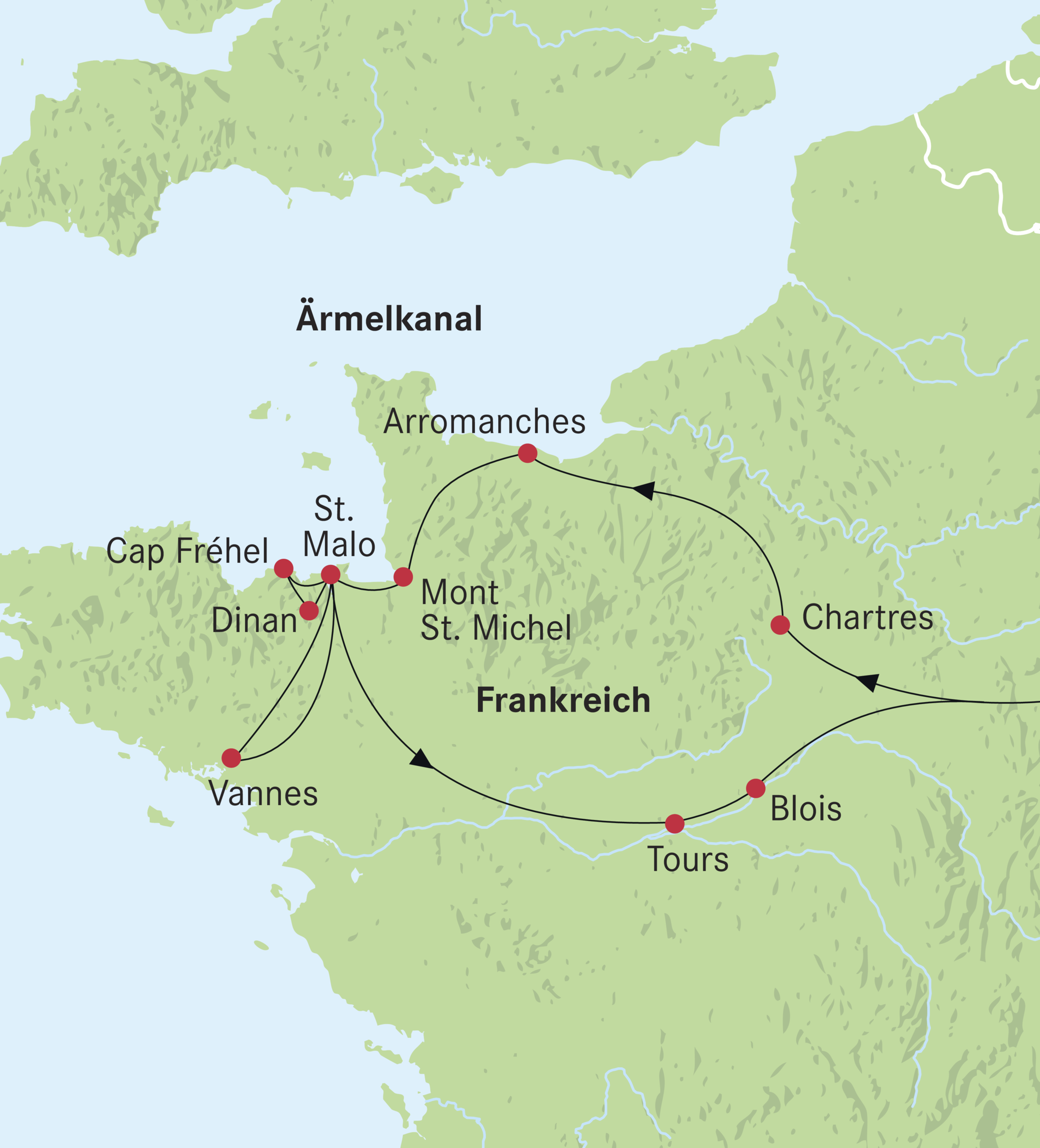 Die Normandie ist wie ein Gemälde: grüne Weiden, goldgelbe Sandstrände und Gaumenfreuden wie Calvados, Cidre und Camembert. In der Bretagne staunen Sie am tosenden Atlantik über die Urgewalten der Natur. Es sind Bilder einer Landschaft von bizarren Felsformationen, wilden Küsten und reichen Traditionen, welche diese Deluxe-Busreise zu einem unvergesslichen Erlebnis machen.
