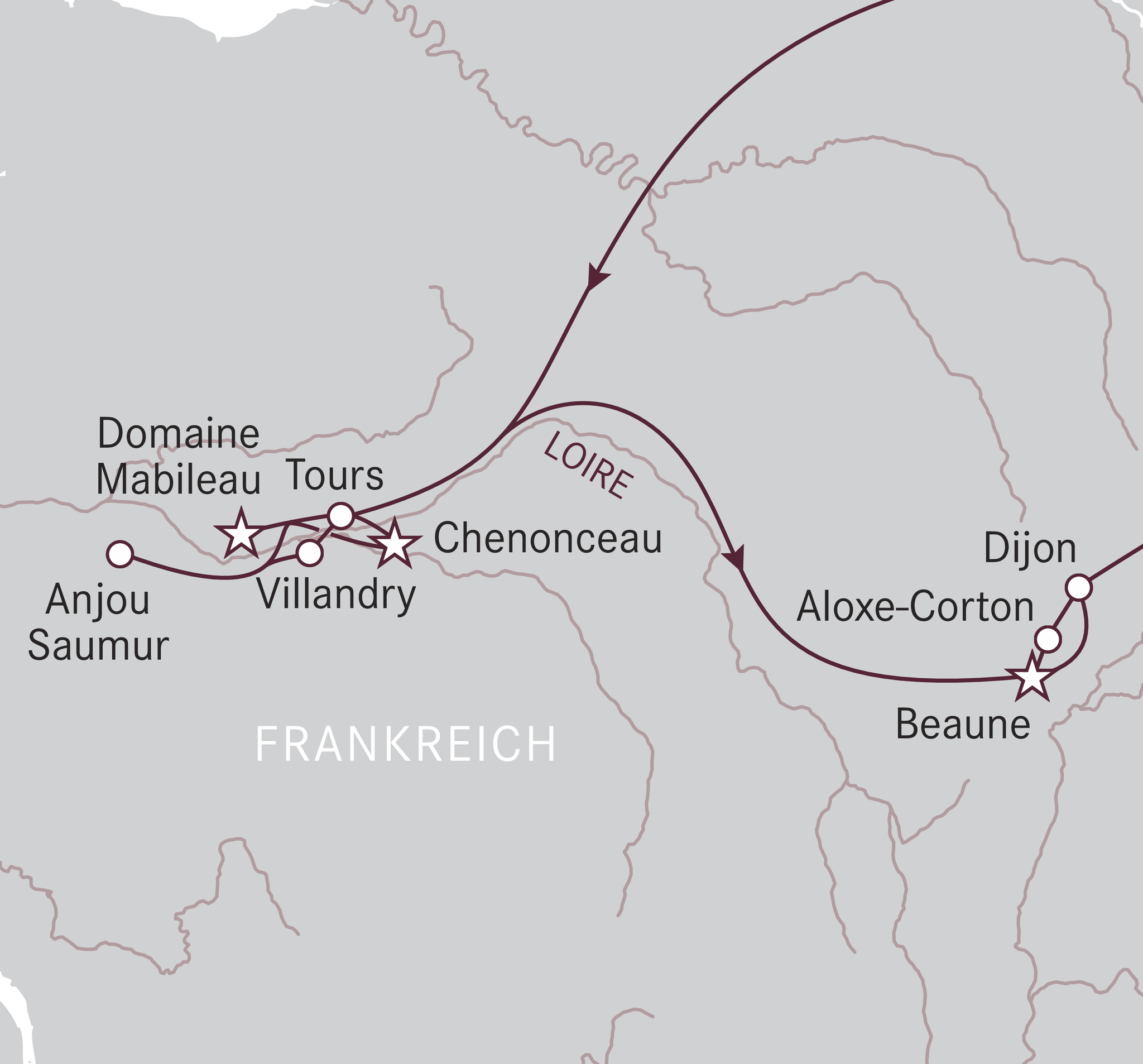 Diese Wein- und Genussreise führt Sie von den königlichen Schlössern wie Chenonceau sowie erfrischenden Weinen des Loiretals zu den renommierten Weingütern des Burgunds. Hier dominieren die Rebsorten Pinot Noir und Chardonnay. Abgerundet wird die Reise durch den Besuch der historischen Städte Tours, Dijon und Beaune.