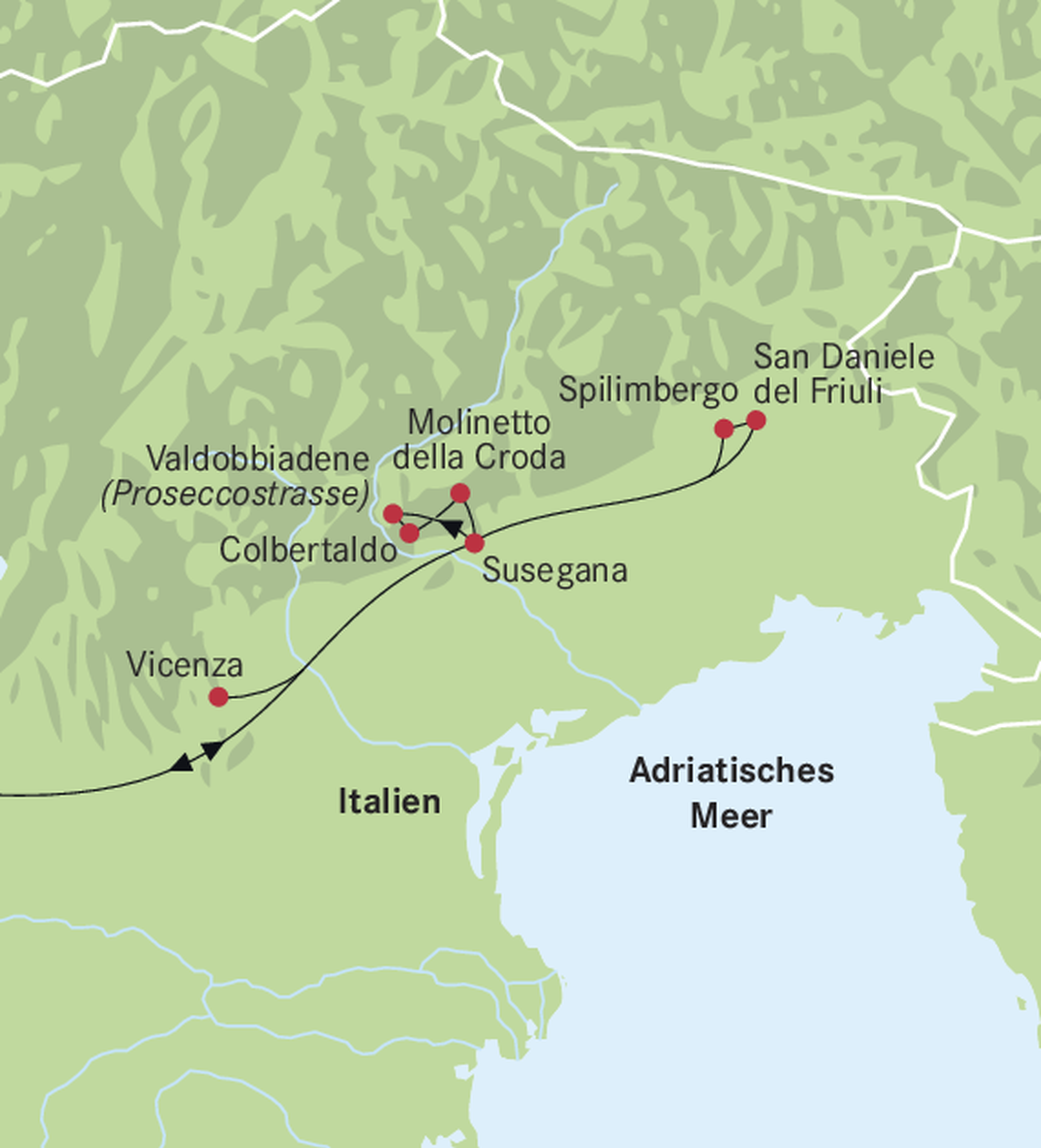 Anreise auf der Gotthardroute und durch das Tessin nach Susegana. Dieser Ort liegt malerisch am Fusse der Prosecco-Hügel und wird von der imposanten mittelalterlichen Burg Castello di San Salvatore überragt.