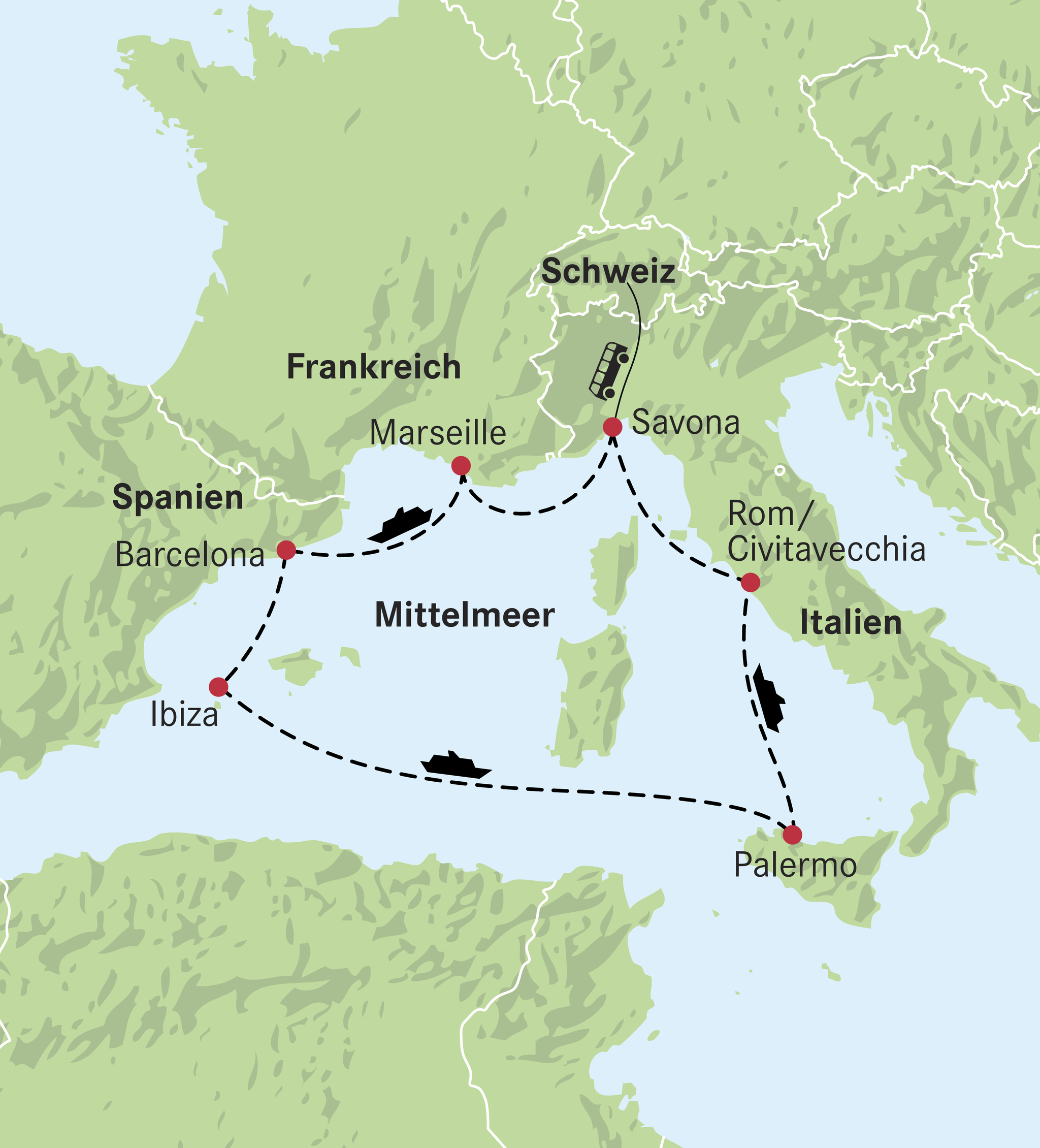 1. Tag: Schweiz - SavonaFahrt nach Savona. Sie beziehen Ihre Kabine und können das Schiff entdecken. Um 18.00 h heisst es: "Leinen los" und das Schiff legt ab.