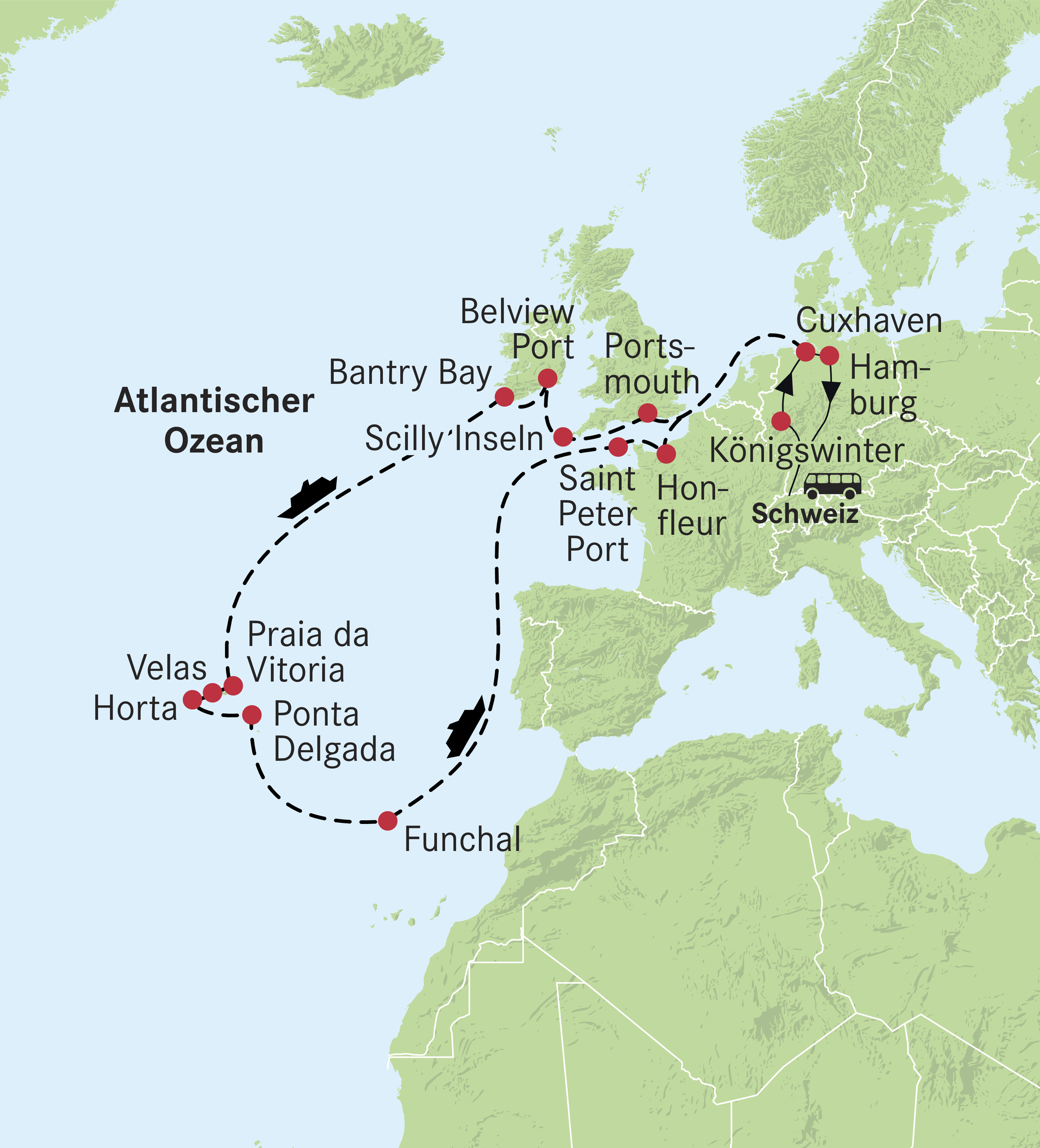 Begeben Sie sich auf eine unvergessliche Kreuzfahrt mit der MS Deutschland zu den faszinierenden Inseln des Atlantiks. Ab Cuxhaven führt Sie diese Reise über die britischen Inseln und Irland zu den atemberaubenden Azoren und dem malerischen Madeira, bevor sie über Frankreich zurückkehrt. Geniessen Sie den erstklassigen Service an Bord, kulinarische Höhepunkte und eine entspannte Atmosphäre, während Sie die Vielfalt des Atlantiks entdecken.