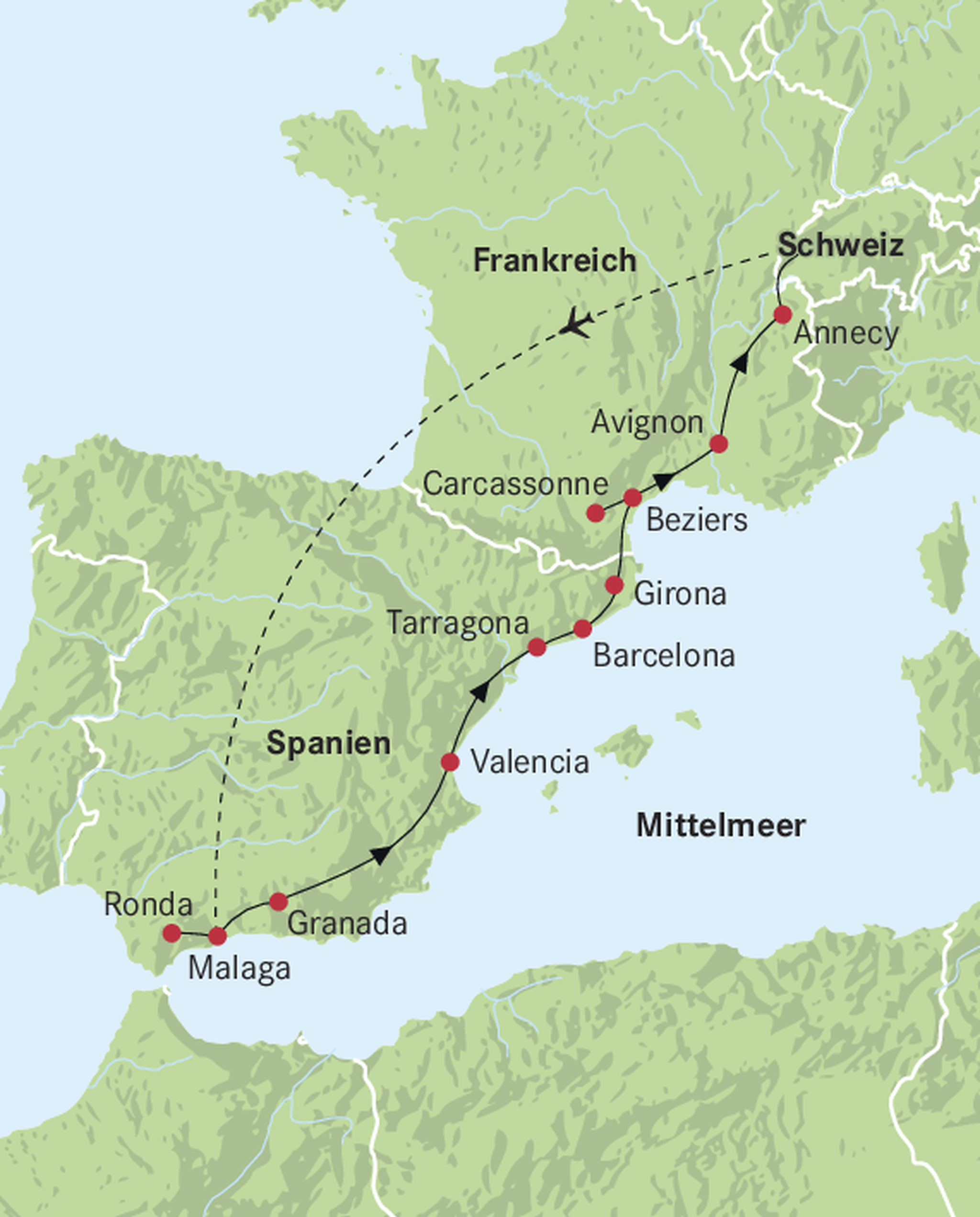 Elf Tage, die den Sommer noch einmal aufleuchten lassen: Von Andalusiens Küste über die maurische Pracht Granadas und die Eleganz Valencias bis zu Barcelonas Architektur-Ikonen. Entlang der französischen Mittelmeerküste reisen wir durch historische Städte und Weinlandschaften, bevor es durch die Alpen zurück in die Schweiz geht.