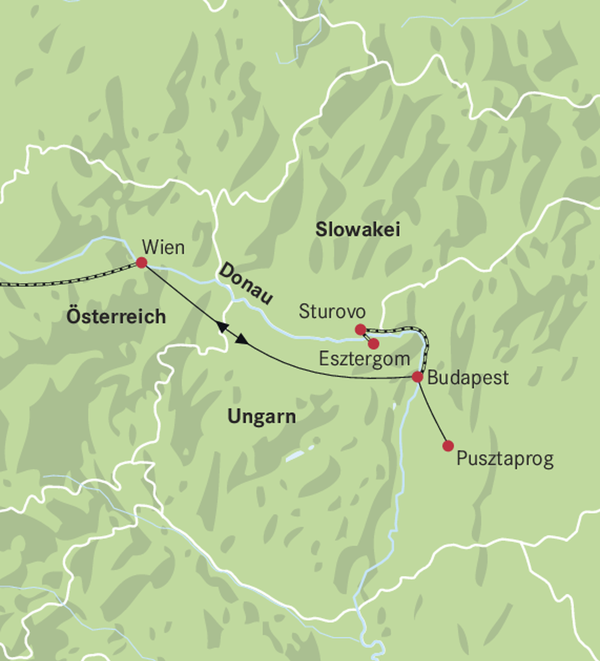 In einem historischen Nostalgiezug reisen Sie von Budapest entlang der Donau und geniessen reizvolle Ausblicke auf weite Flusslandschaften. Bei Szob überqueren Sie die Grenze zur Slowakei und erreichen Sturovo. Von dort führt Ihr Ausflug weiter nach Esztergom, wo Sie die eindrucksvolle Basilika besichtigen können. Am Nachmittag reisen Sie mit dem Nostalgiezug zurück nach Budapest.