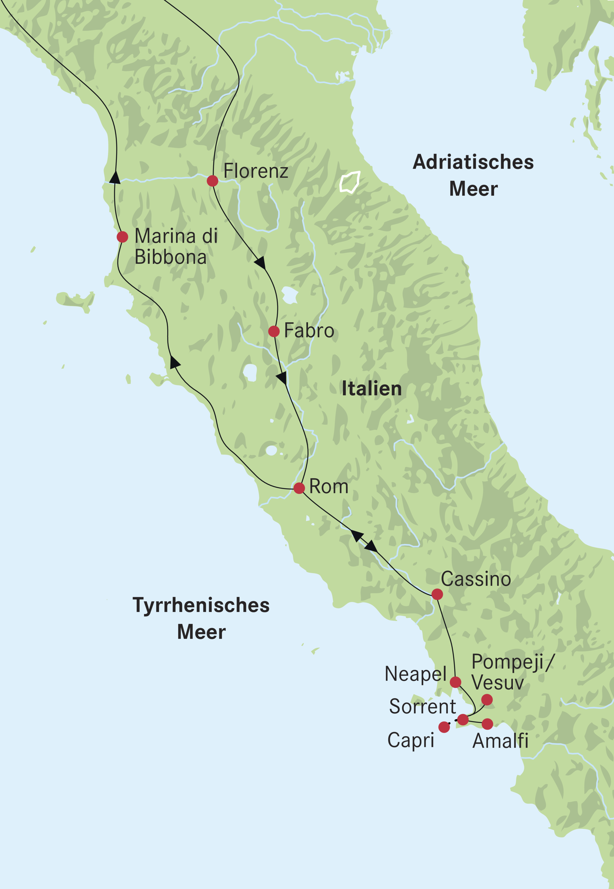 Sie verlassen die Halbinsel und den Golf von Neapel und fahren um Rom herum dem tirrhenischen Meer entlang nach Marina di Bibbona in der Toscana.