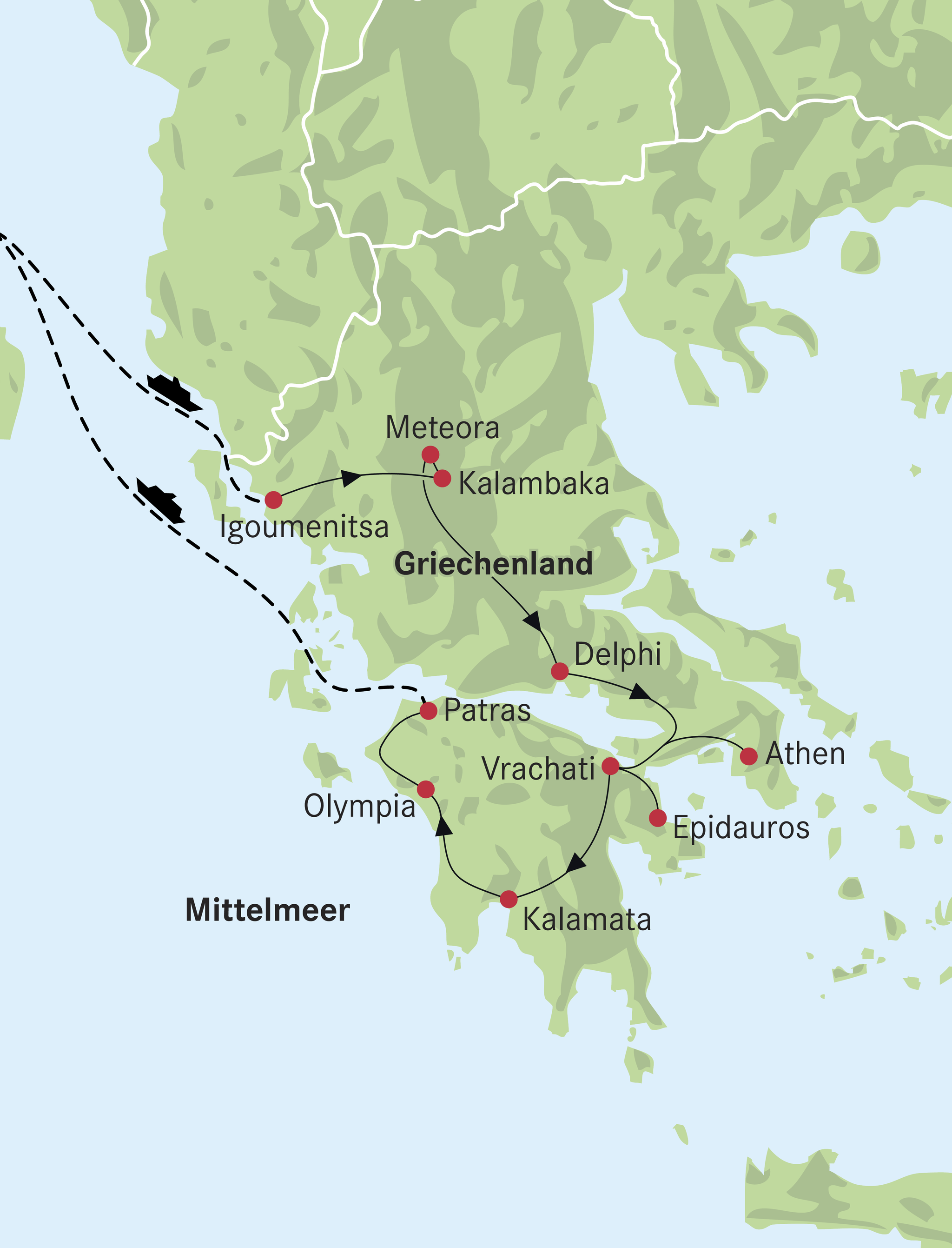 Vom Südpeloponnes führt die Reise nach Olympia. Danach weiter nach Patras und Einschiffung auf eine Fähre nach Italien.