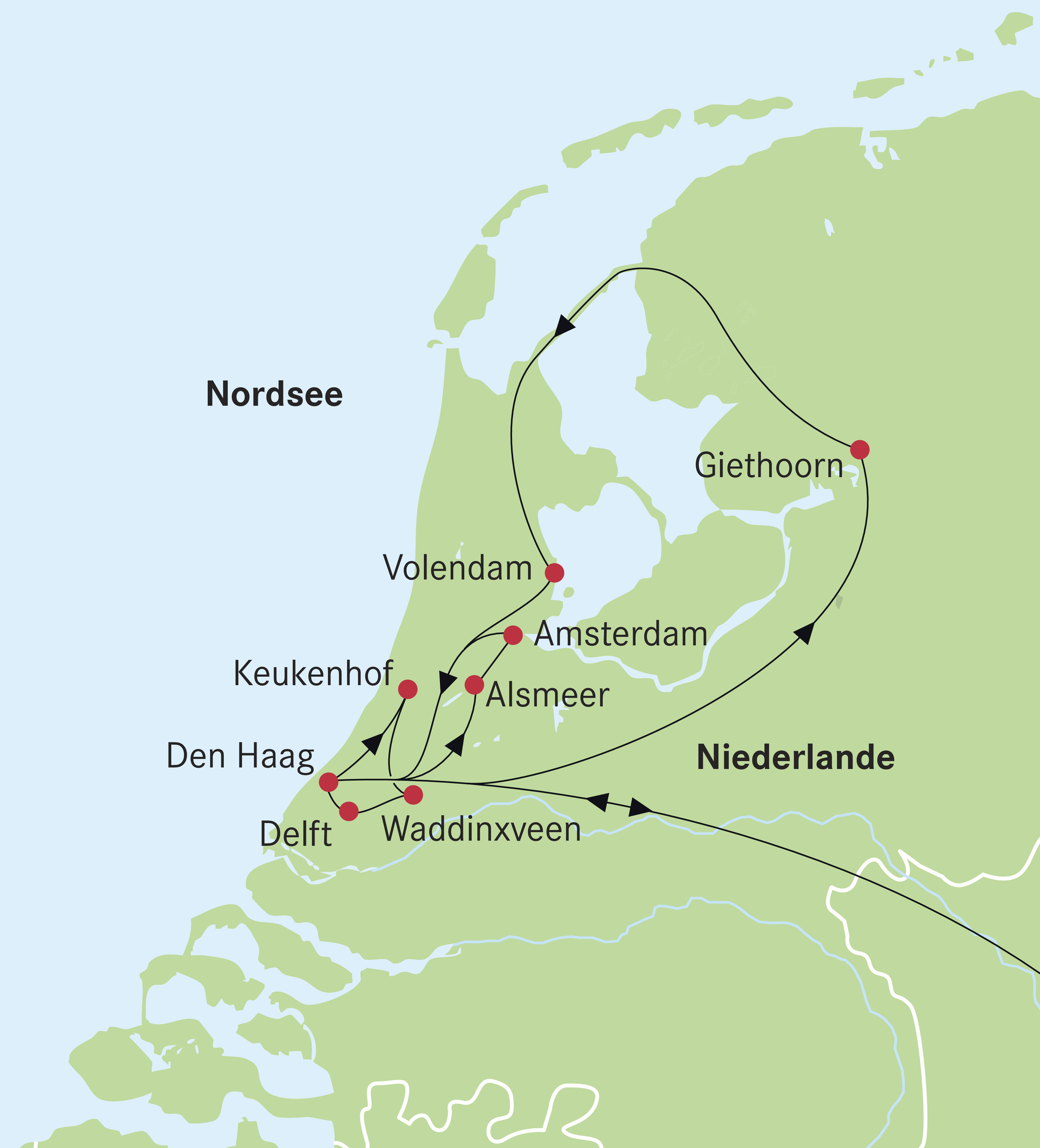 Ausflug ins "Grüne Venedig" nach Giethoorn. Nutzen Sie die Freizeit zu einer romantischen Bootsfahrt durch die schmalen, idyllischen Dorfkanäle. Anschliessend Weiterfahrt in die nördliche Provinz Friesland mit Halt im romantischen Fischerstädtchen Volendam. Der 30 km langen Abschlussdeich trennt die Waddenzee vom Ijsselmeer.