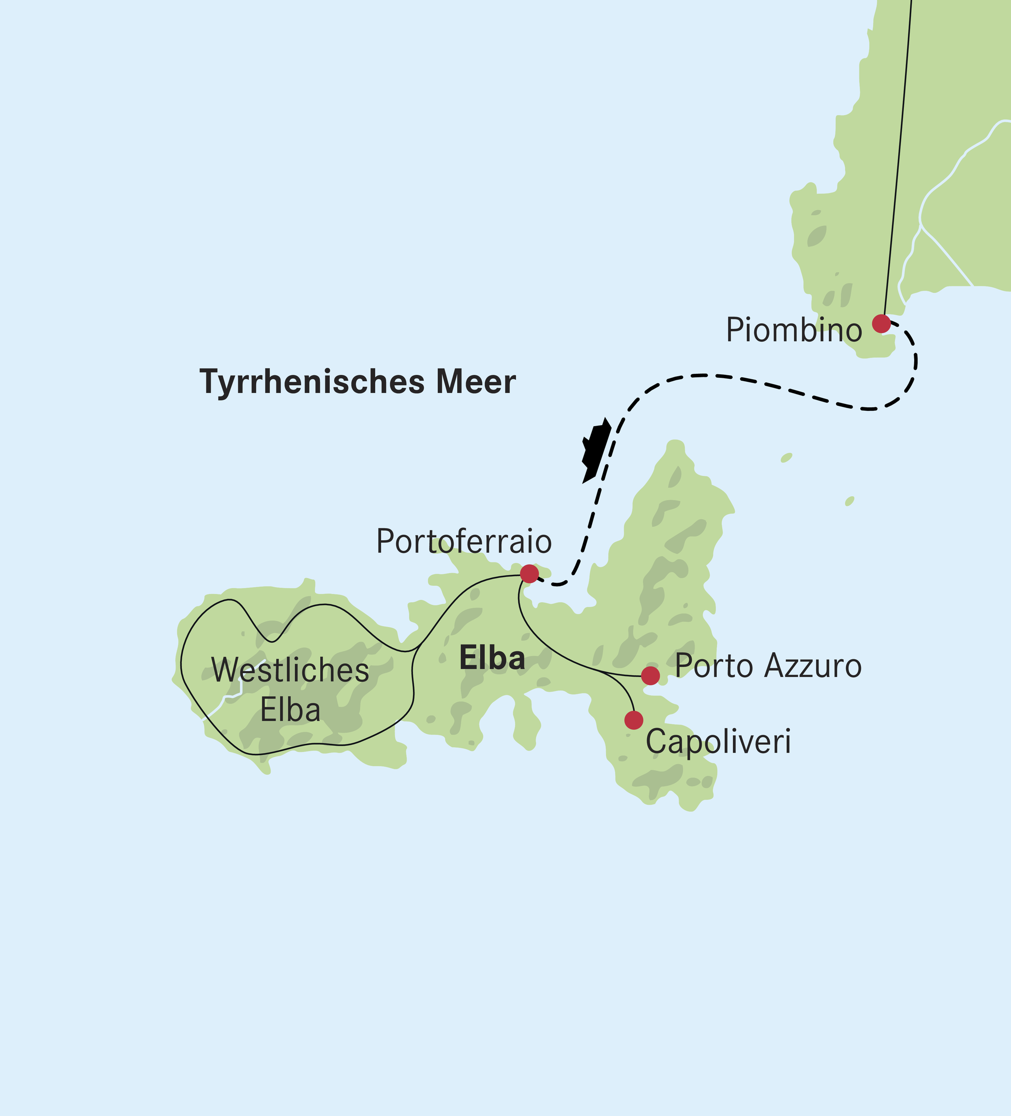 Fahrt nach Piombino, wo Sie mit der Fähre auf die Insel Elba übersetzten. Während der Überfahrt geniesen Sie herrliche Ausblicke auf das Tyrrhenische Meer. Nach der Ankunft im belebten Hafen von Portoferraio Weiterfahrt zu Ihrem Hotel.