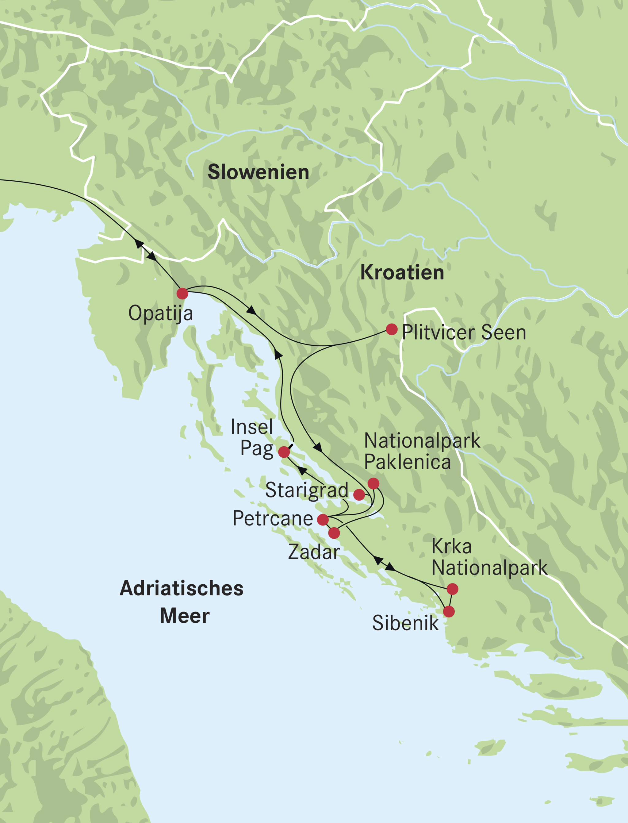 2. Tag: Opatija - Plitvicer SeenFahrt zum Nationalpark Plitvicer Seen. Die Seenplatte besteht aus 16 übereinander liegenden, kristallklaren Seen, die durch Wasserfälle und Kaskaden miteinander verbunden sind. Unter anderem sehen Sie den Kaluderovac-See, der als "Silbersee" im Film "Der Schatz im Silbersee" bekannt wurde und die "Schatz-Höhle" in der darüberliegenden Felswand. Sie erkunden den Nationalpark zu Fuss, per Boot und Panoramafahrzeug. Weiterreise an die Adria nach Petrcane.