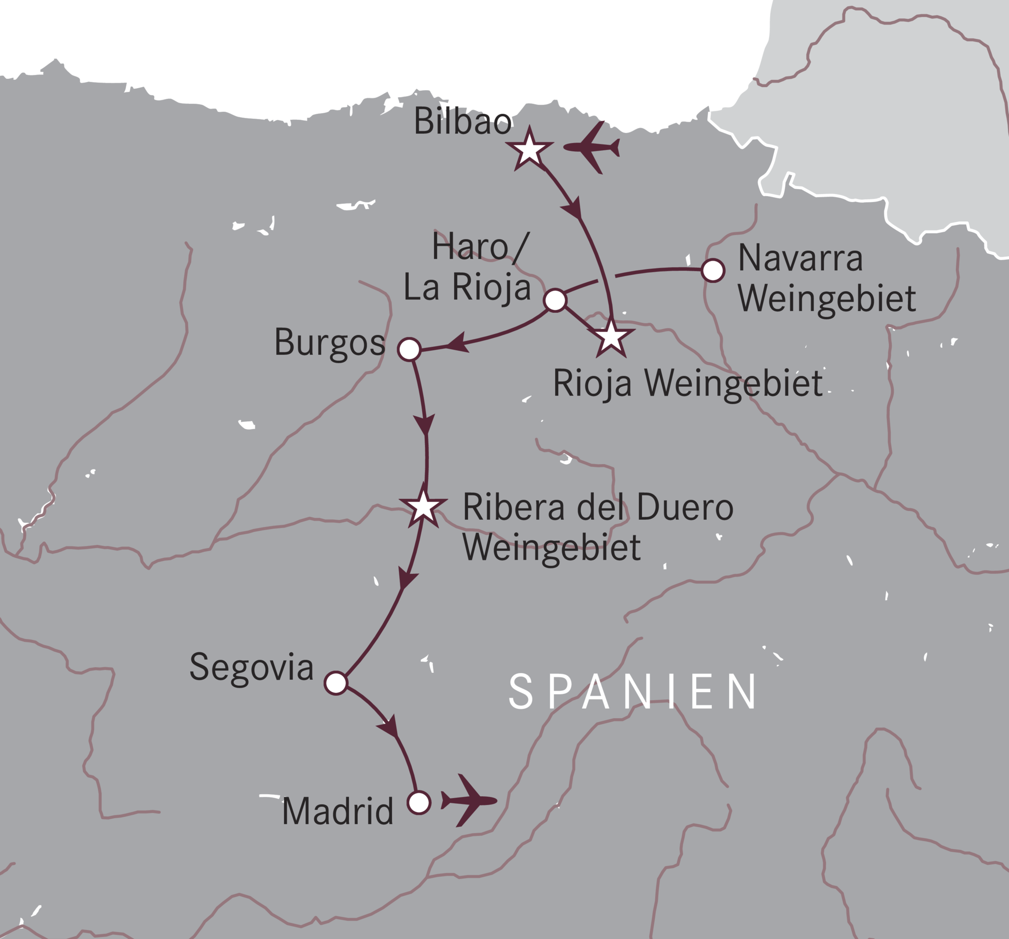 Eine exklusive Weinreise im Wechselspiel zwischen Tradition und Moderne. Sie beginnt im architektonisch reizvollen Juwel Bilbao und führt Sie durch die angesagten Weinregionen Rioja, Navarra und Ribera del Duero. Hier befinden sich bemerkenswerte Weingüter mit hervorragenden Erzeugnissen sowie zahlreiche Bodegas und Fincas.