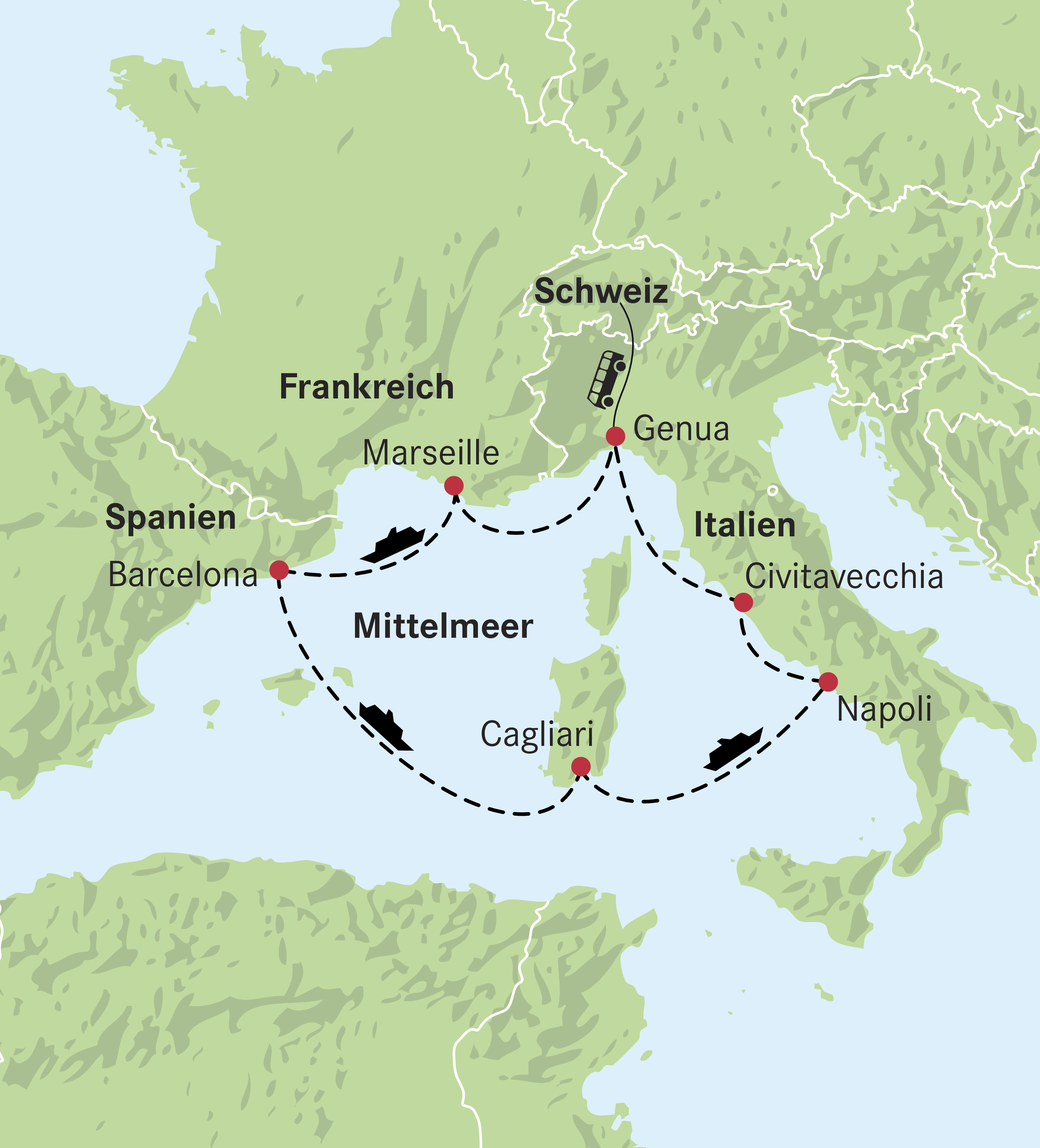 Am Morgen erreichen Sie wieder Genua. Rückreise in die Schweiz.