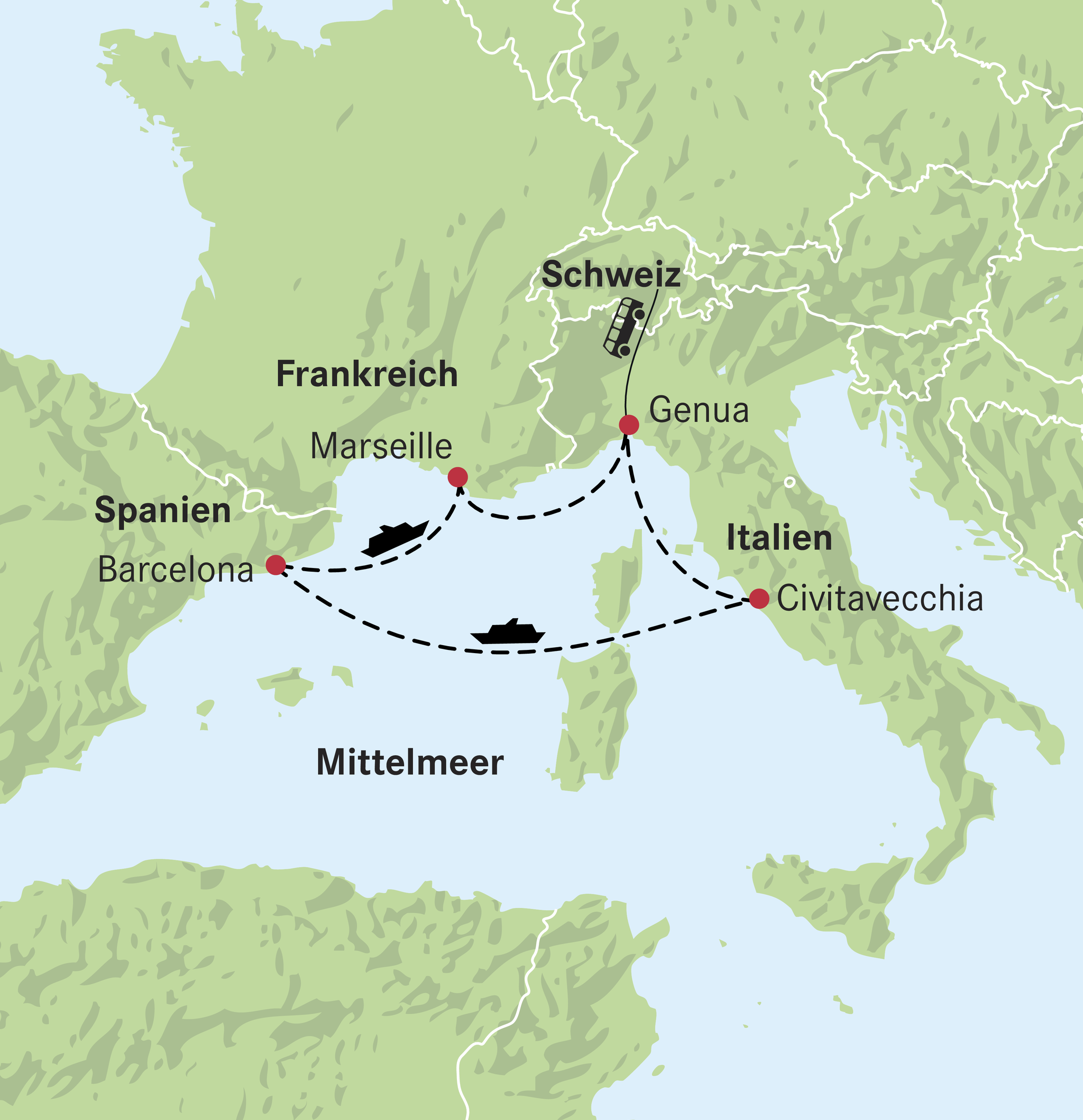 6. Tag: Genua - Schweiz Am Morgen erreichen Sie wieder die italienische Stadt Genua. Rückreise in die Schweiz.