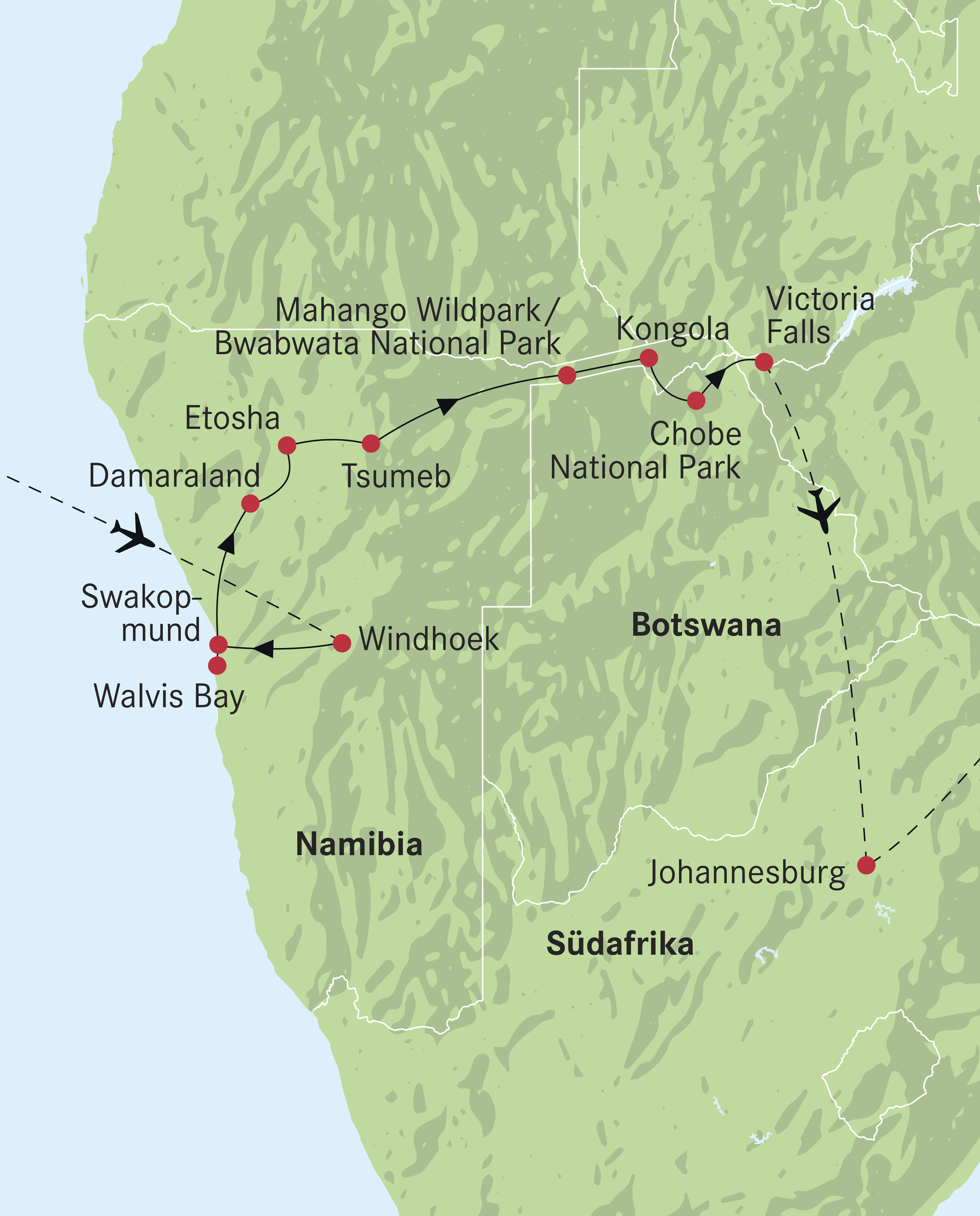 Der Morgen steht Ihnen zur freien Verfügung. Sie haben die Möglichkeit an einem Helikopterrundflug über die majestätischen Wasserfälle teilzunehmen (fakultativ). Transfer zum Flughafen Victoria Falls und Heimflug via Johannesburg.