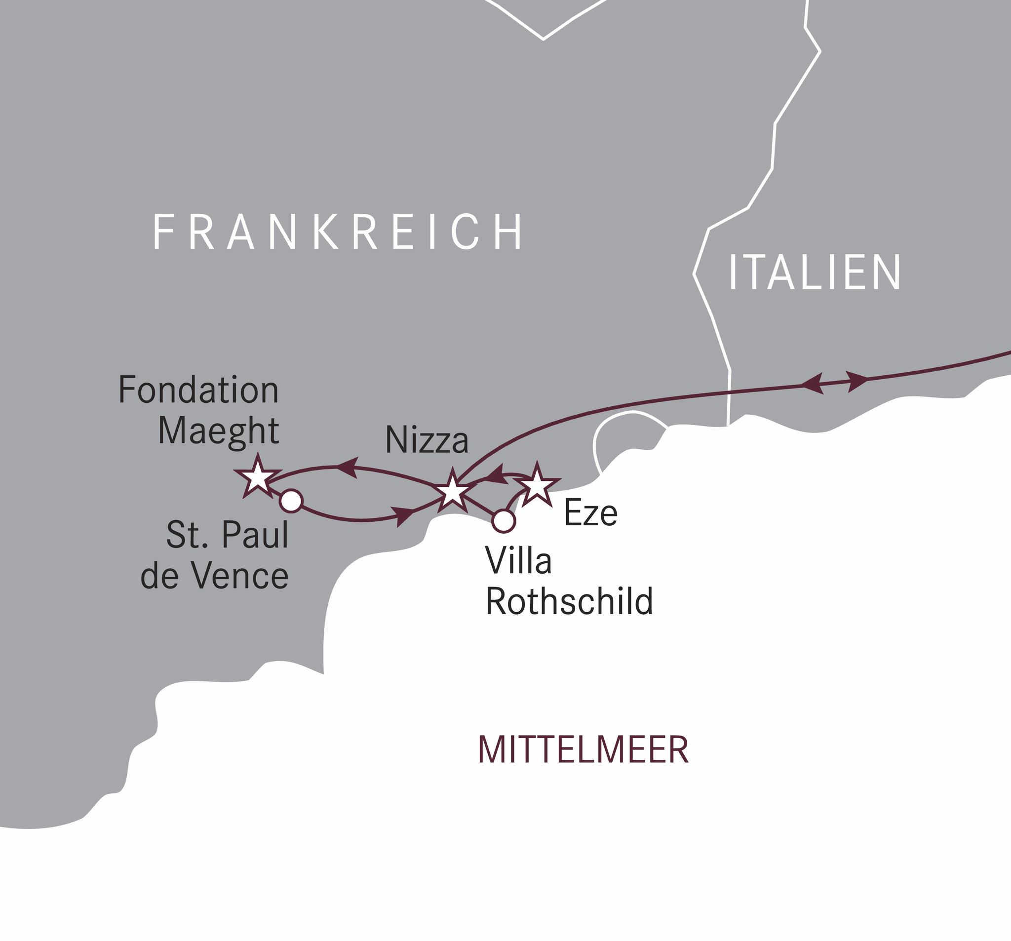 Künstler wie Matisse, Renoir und Chagall fanden an der Côte d’Azur ihr Paradies aus Licht, Farbe und Leichtigkeit. In Nizza und den umliegenden Orten spüren Sie jene Harmonie, die Maler und Dichter seit jeher inspiriert. Eine Reise zwischen Meer und Hügeln, die Savoir-vivre, Kultur und Genuss auf wunderbar leichte Weise vereint.