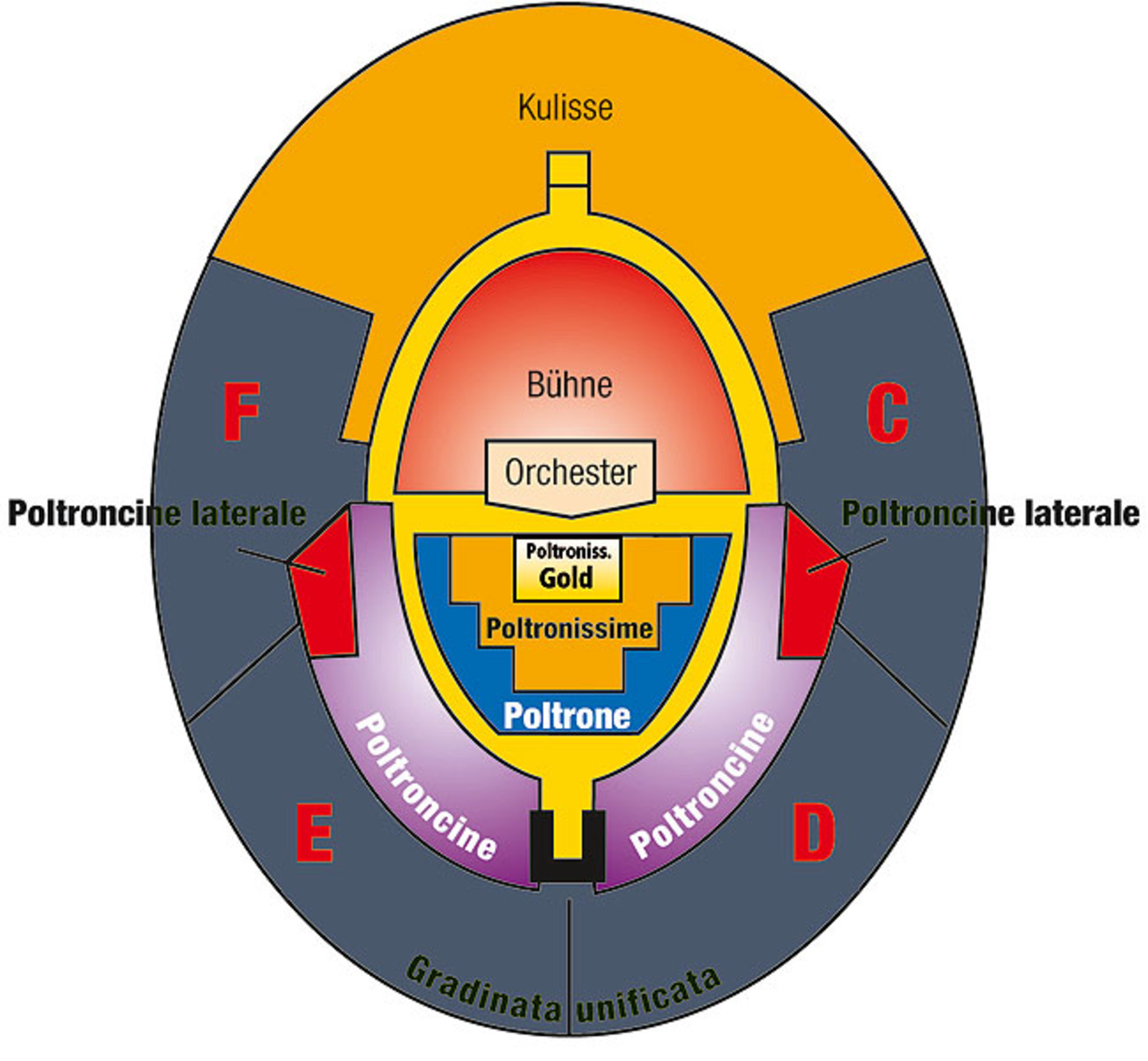 Gepolsterte Sitze im Parkett mit bester Sicht auf die Bühne. Poltronissime Gold ist die zweithöchste Kategorie in der Arena.