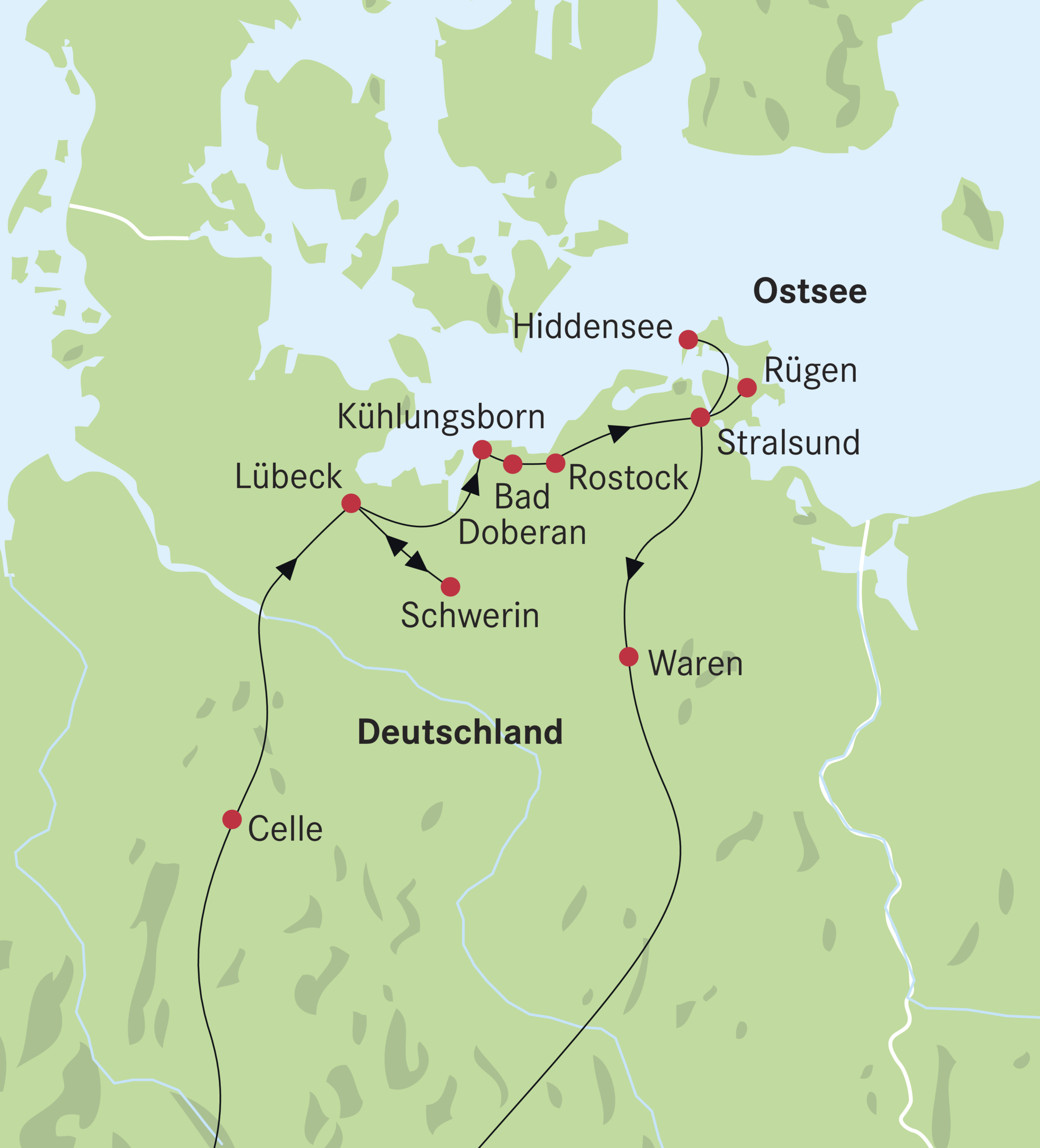 Tauchen Sie ein in die weltberühmten Landschaften eines Caspar David Friedrich, in die ursprüngliche Natur des seenreichen Mecklenburg-Vorpommern. Lassen Sie sich während dieser Deluxe-Busreise an die deutsche Ostsee vom Charme der alten Hansestädte verzaubern und geniessen Sie Impressionen von Küsten und Inseln. Sie logieren mehrere Nächte in der pittoresken Hansestadt Stralsund.