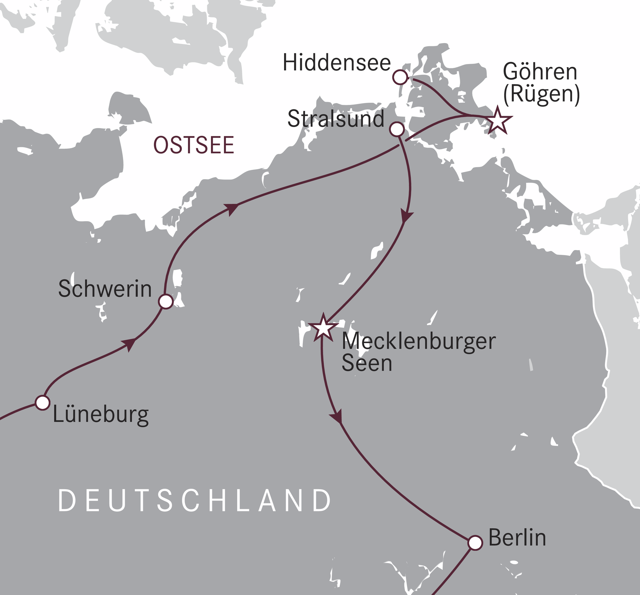 Auf Rügen logieren Sie 3 Nächte im ****Vju Hotel Rügen in Göhren. Das Hotel liegt eingebettet in einer parkähnlichen Anlage und auf dem höchsten Punkt einer ins Meer ragenden Landzunge. Das luxuriöse *****Hotel Eurostars Berlin an der historischen Einkaufsmeile Friedrichstrasse in Berlin-Mitte ist für 2 Nächte Ihr Zuhause. In Hildesheim logieren Sie in einem ausgezeichneten Erstklasshotel.