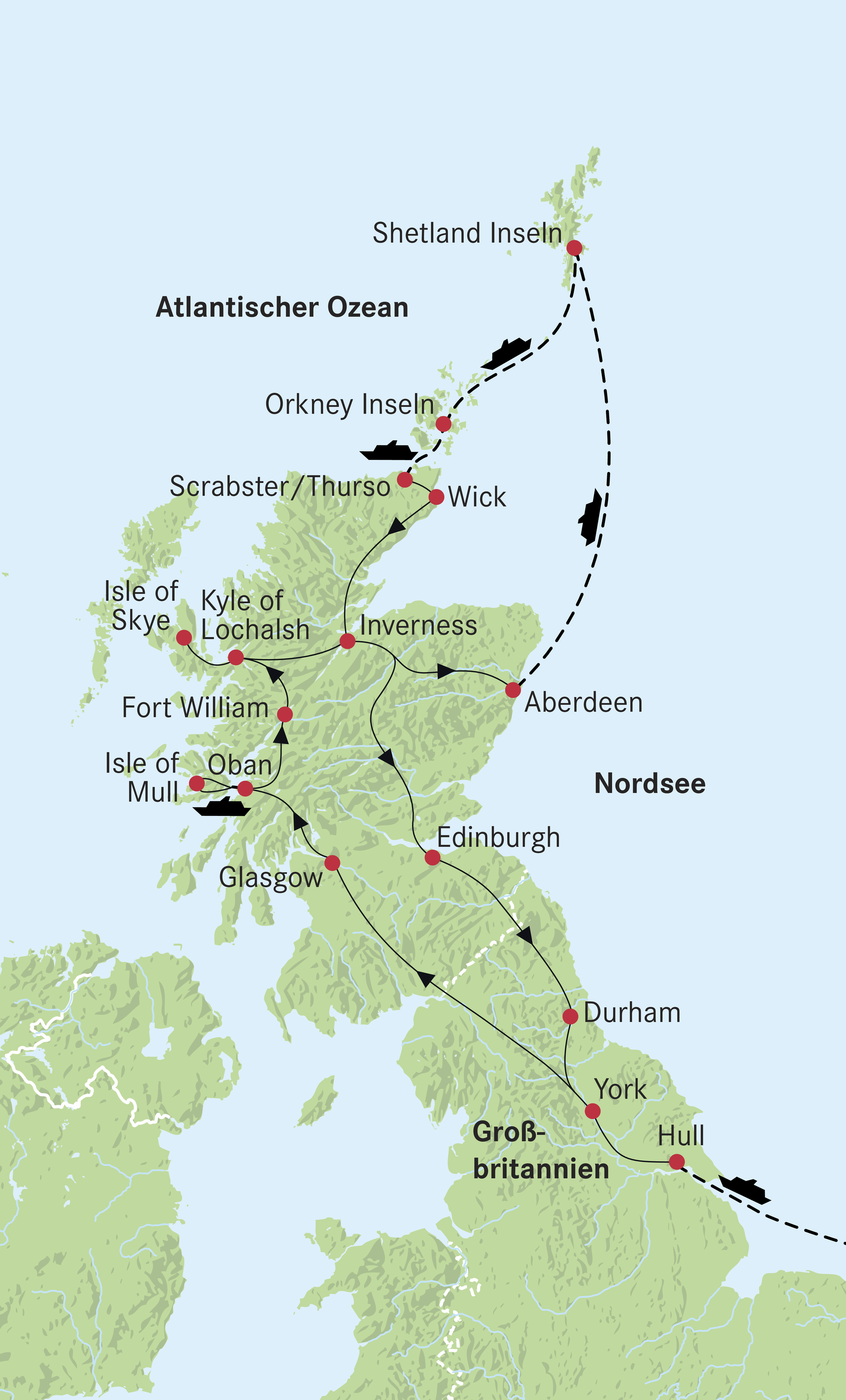 Ausschiffung in Hull. An der englisch-schottischen Grenze befindet sich die romantische Hochzeitsschmiede von Gretna Green. In dieser traumhaften Umgebung liessen sich früher junge Pärchen aus England ohne Erlaubnis der Eltern trauen. Durch die South Uplands gelangen Sie nach Glasgow und schliesslich nach Oban.