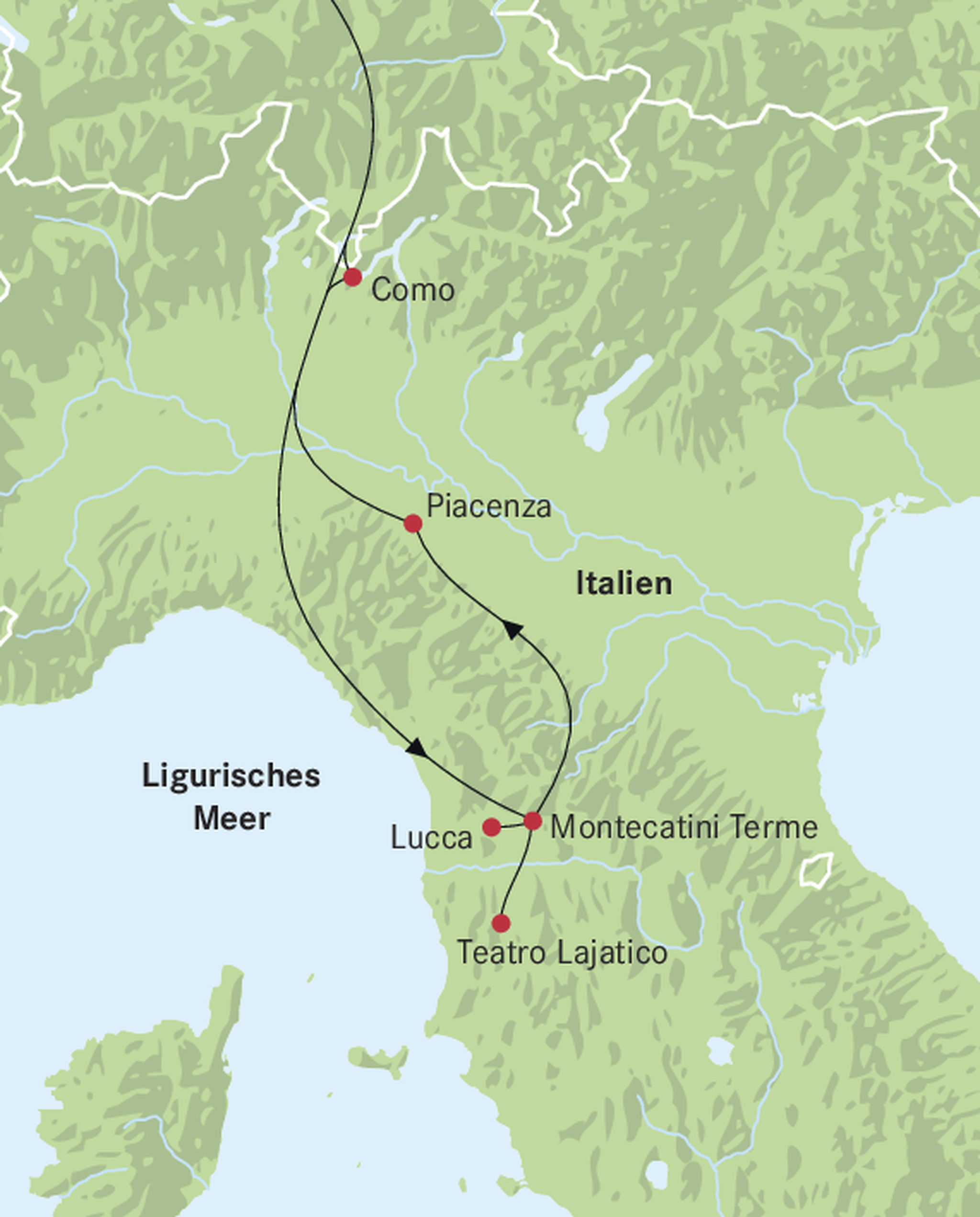 Anreise via Gotthardroute und das Tessin an den Comer See. In der schönen südländischen Altstadt geniessen Sie Ihren Mittagshalt mit einer grossen Auswahl an Restaurants. Gegen Abend erreichen Sie Montecatini Terme in der Toskana.