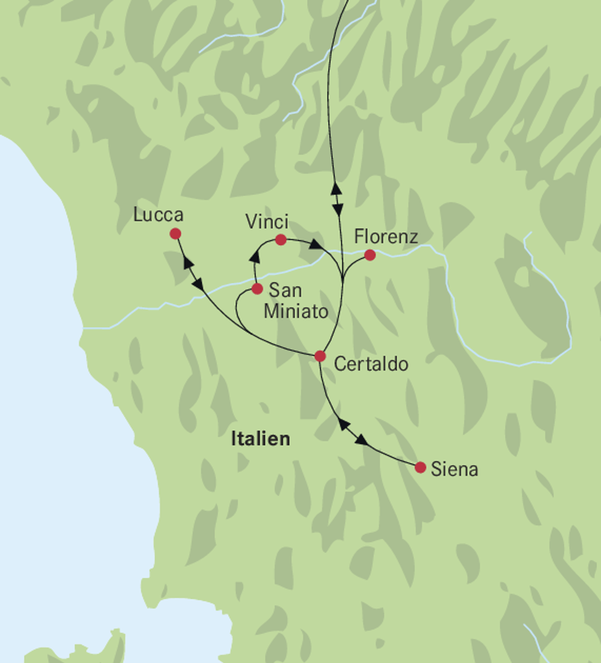 Die Toscana ist Europas klassisches Reiseland. Architekturdenkmäler, Kunstschätze und mittelalterlicher Charme verstecken sich hinter den wohlklingenden Namen wie Siena - Lucca und Florenz. Die Renaissance-Stadt und das 4* Hotel mit Flair in Montaione machen diese Deluxe Busreise zu einem unvergesslichen Erlebnis und einmalige Ferien.