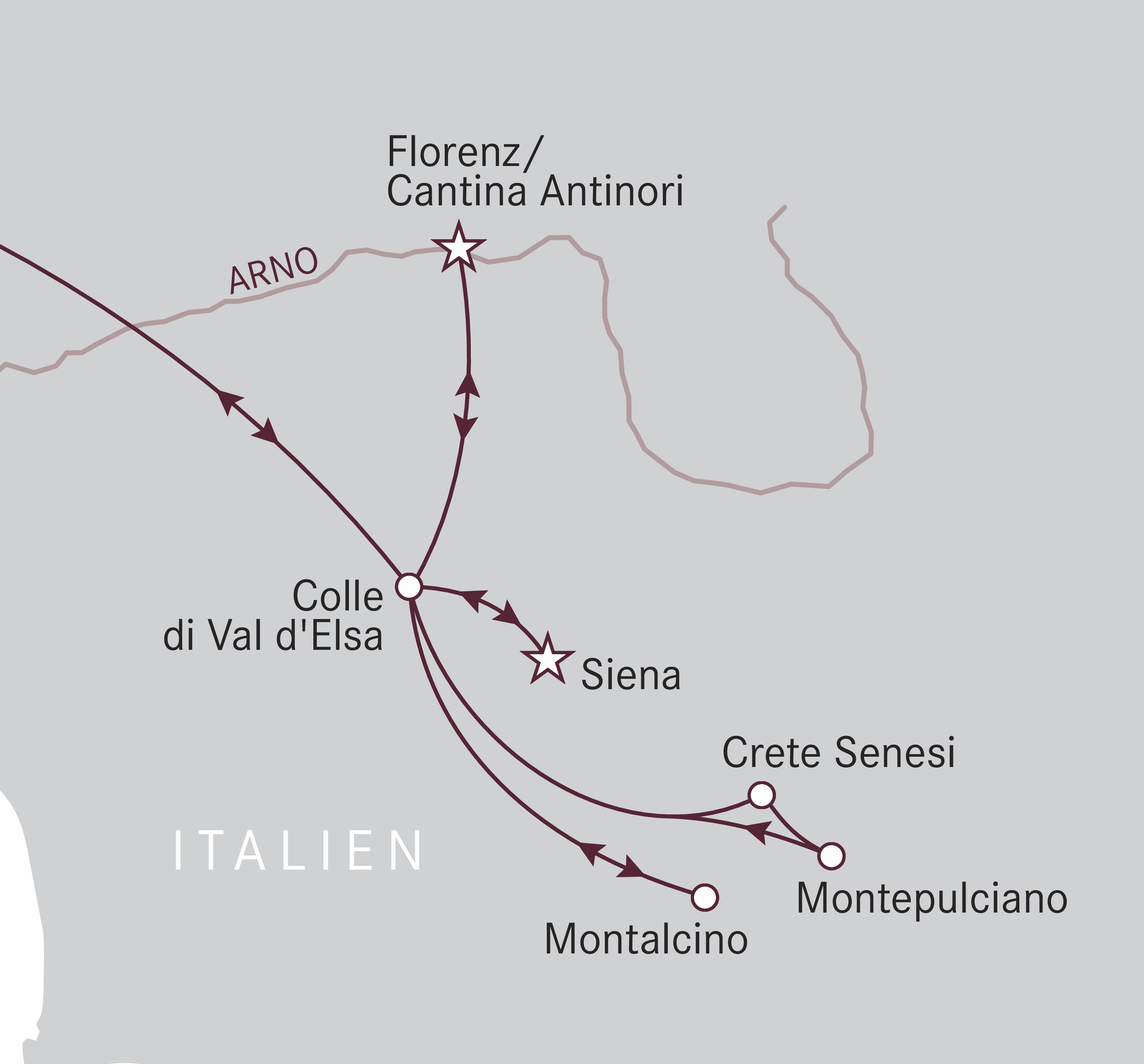Diese Wein- und Genussreise führt Sie in die Toskana. Erkunden Sie das Herz des Sangiovese, wo Sie die weltberühmten Regionen Chianti Classico, Montepulciano und Montalcino erkunden. Abgerundet wird das Erlebnis durch die toskanische Küche mit ihren Spezialitäten und Olivenöl sowie den kulturellen Highlights wie Siena und Florenz.