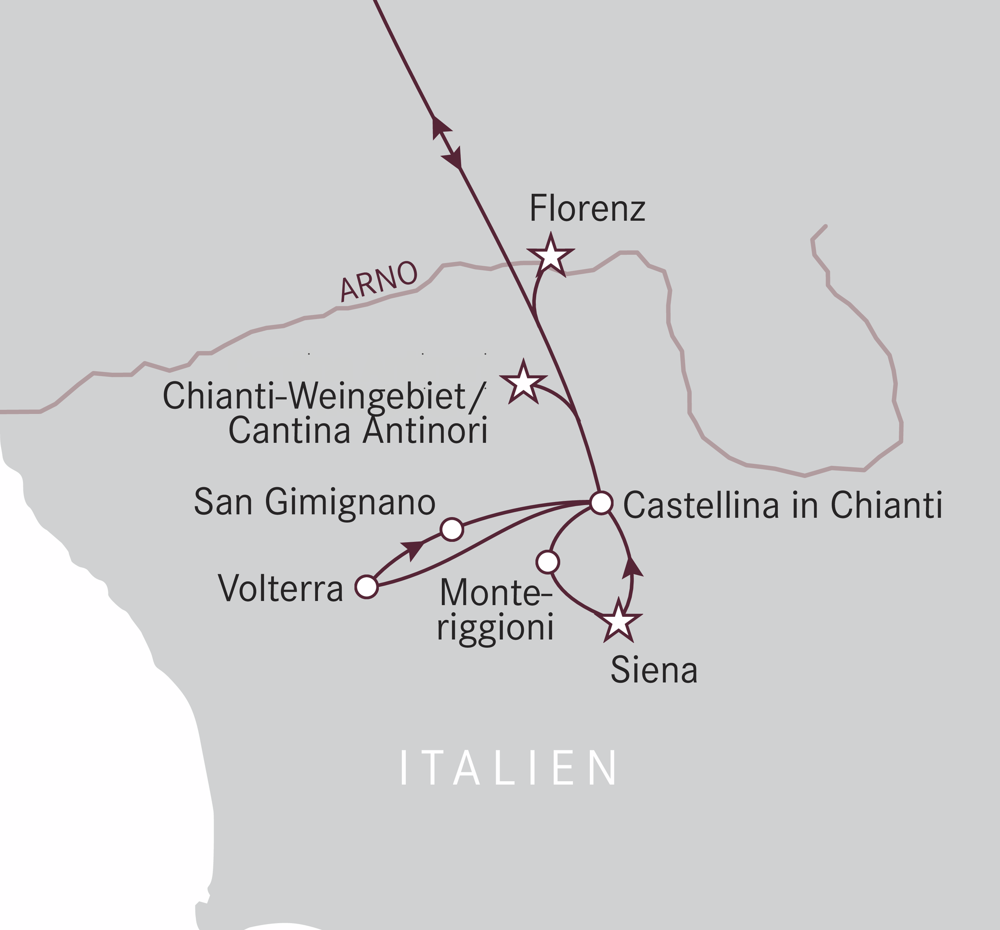 Die Toskana vereint die Wiege der Renaissance - Florenz - mit dem mittelalterlichen Siena, der spektakulären Festung von Monteriggioni und dem von Türmen geprägten San Gimignano. Lassen Sie sich im Chianti-Gebiet von kulinarischen Leckerbissen verwöhnen. Bestaunen Sie die malerischen Hügellandschaften und die berühmten Weinberge.