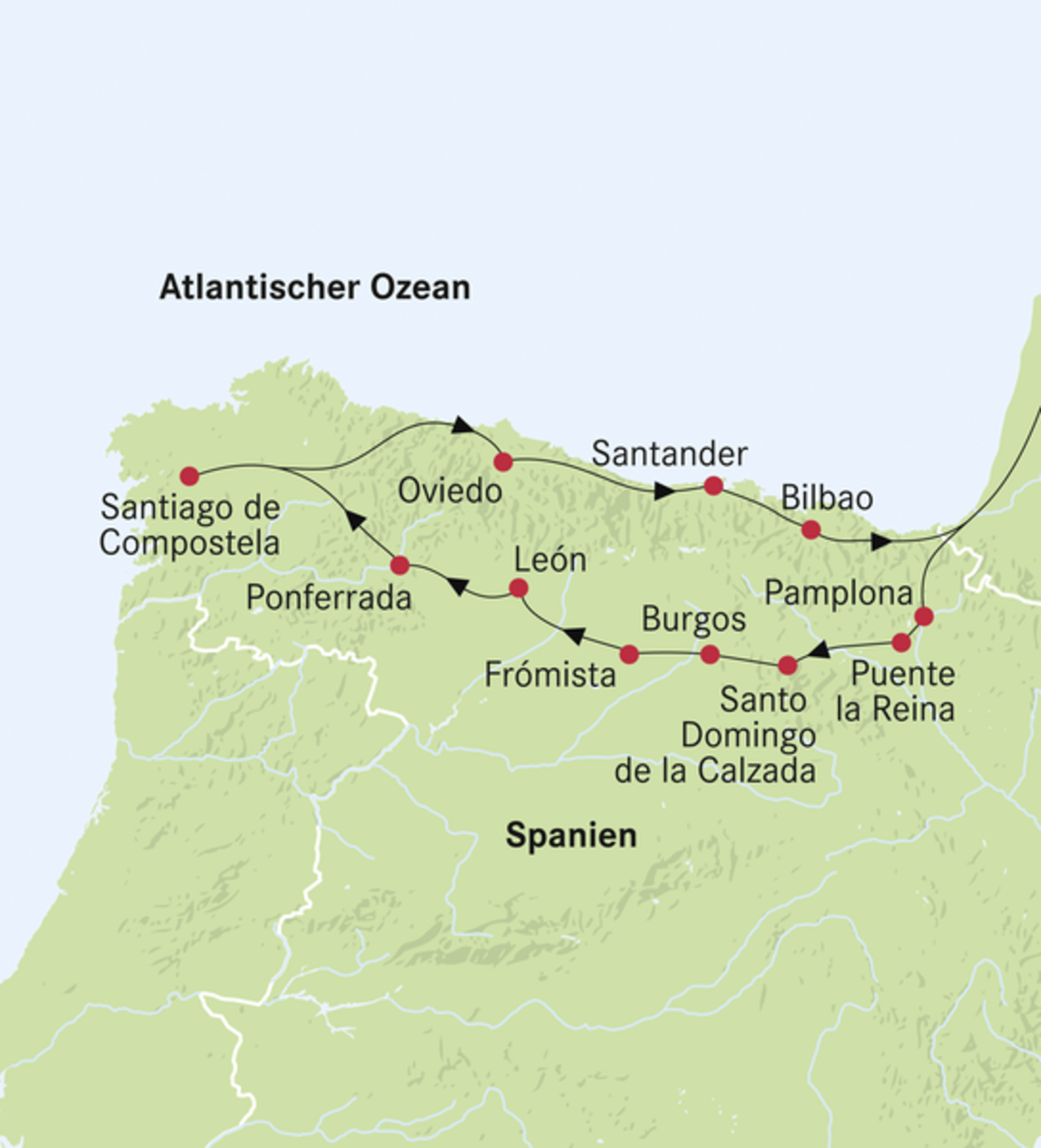 Auf dieser eindrücklichen Wanderreise in Begleitung des Deluxe-Bus erwartet Sie eine wunderbare Kombination aus dem klassischen Jakobsweg und der traumhaften Atlantikküste in Spaniens grünem Norden. Der Camino Francés stellt den wohl berühmtesten und schönsten Abschnitt der Jakobswege dar.