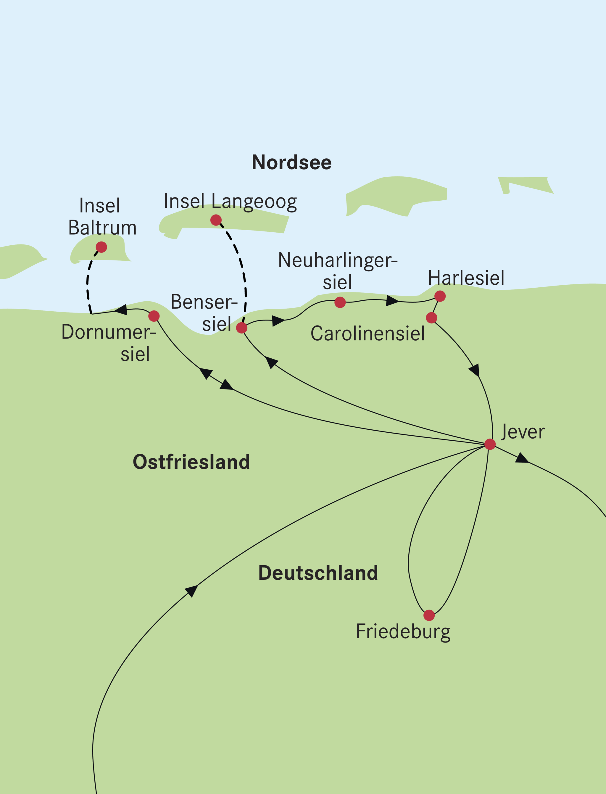 Tauchen Sie ein in die maritime Pracht der Nordsee und von Ostfriesland. Diese Wanderreise enthält alle Zutaten für einen herrlichen Aufenthalt: eine Brise frischer Nordseewind, beeindruckendes Wattenmeer, herrliche Dünenlandschaften, malerische Fischerdörfer, Windmühlen und freundliche Ostfriesen.