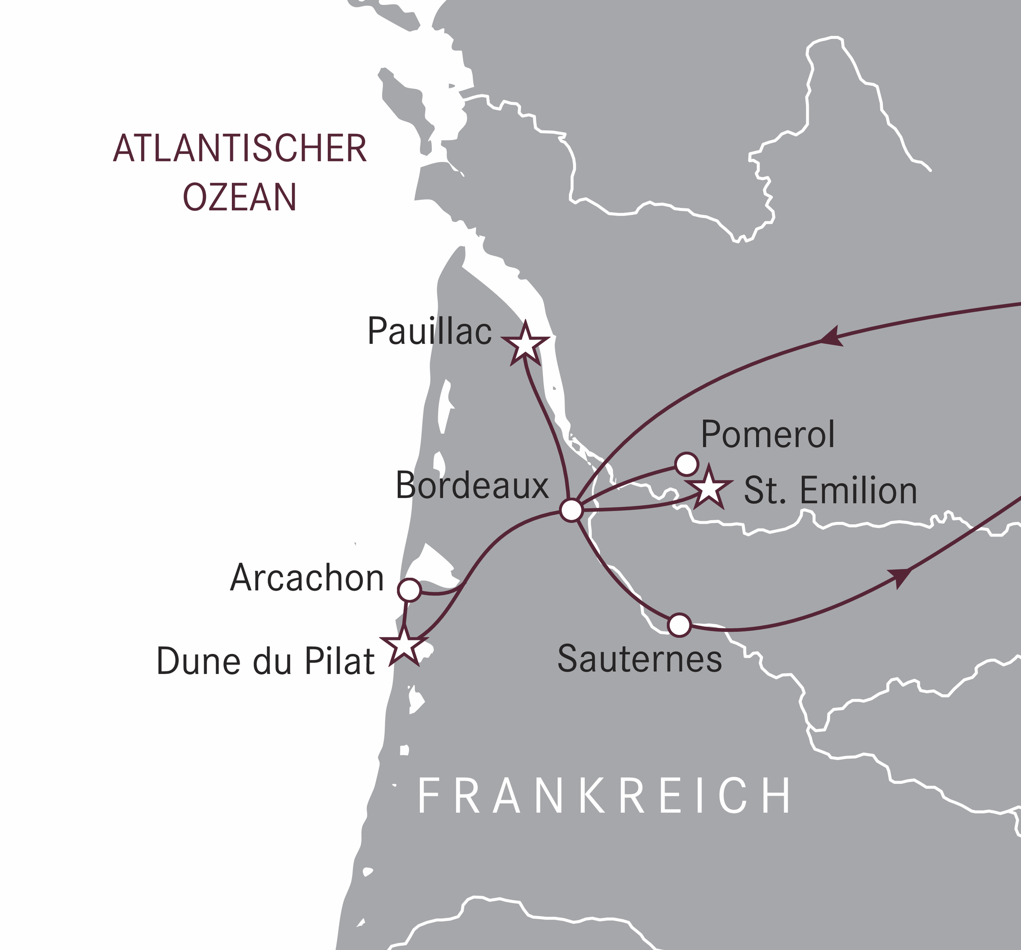 Geniessen Sie eine aussergewöhnliche Reise durch die malerischen Weinberge und lassen Sie sich von den Châteaux und deren weltberühmten Tropfen verzaubern. Viele der grossen Crus des Bordeaux stammen aus den Regionen Médoc, Saint Emilion und Graves. Weitere kulinarische Highlights runden diese Genussreise ab.