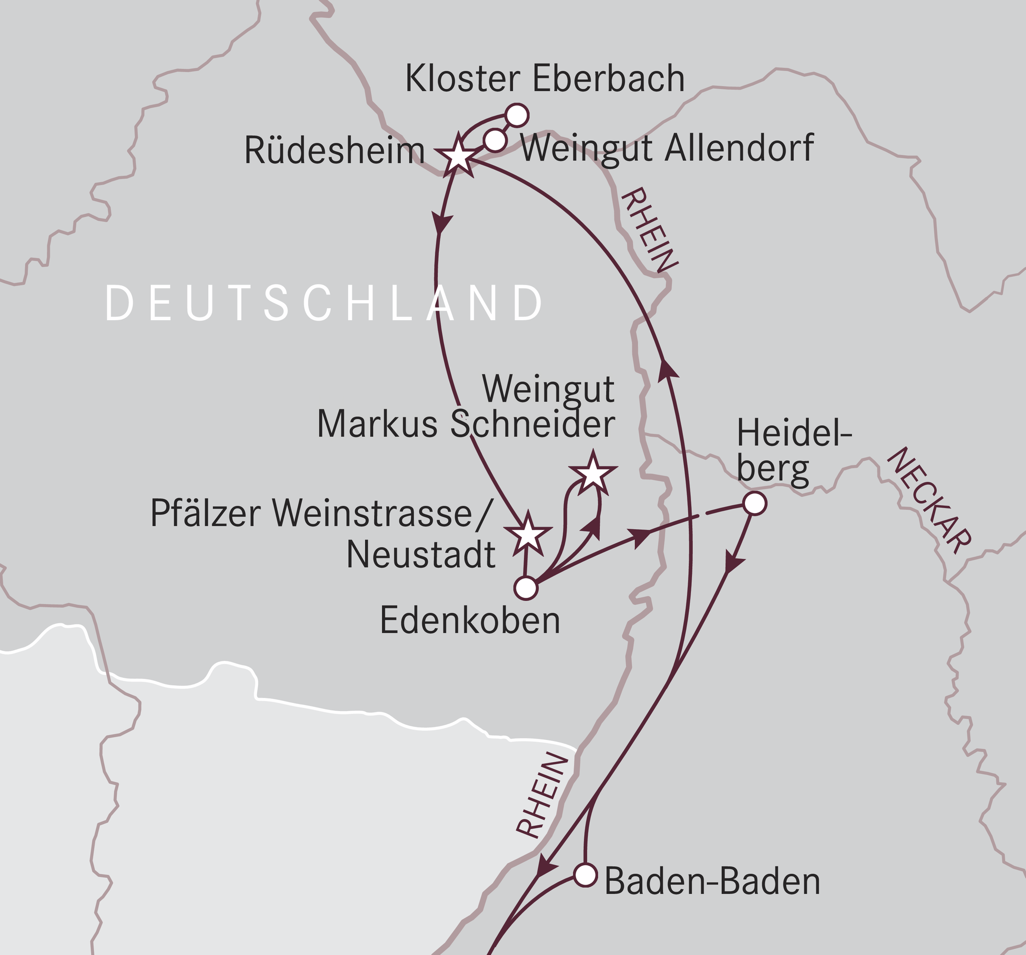 Auf dieser Kultur- und Weinreise haben Sie die Gelegenheit, gleich zwei deutsche Weinregionen kennenzulernen. Einerseits das geschichtsträchtige Rheingau mit seinem Magneten, der Riesling-Route. Andererseits die beliebte Pfalz mit ihren Rebsorten wie Riesling, Grauburgunder, Weissburgunder, Sauvignon Blanc oder Müller Thurgau.