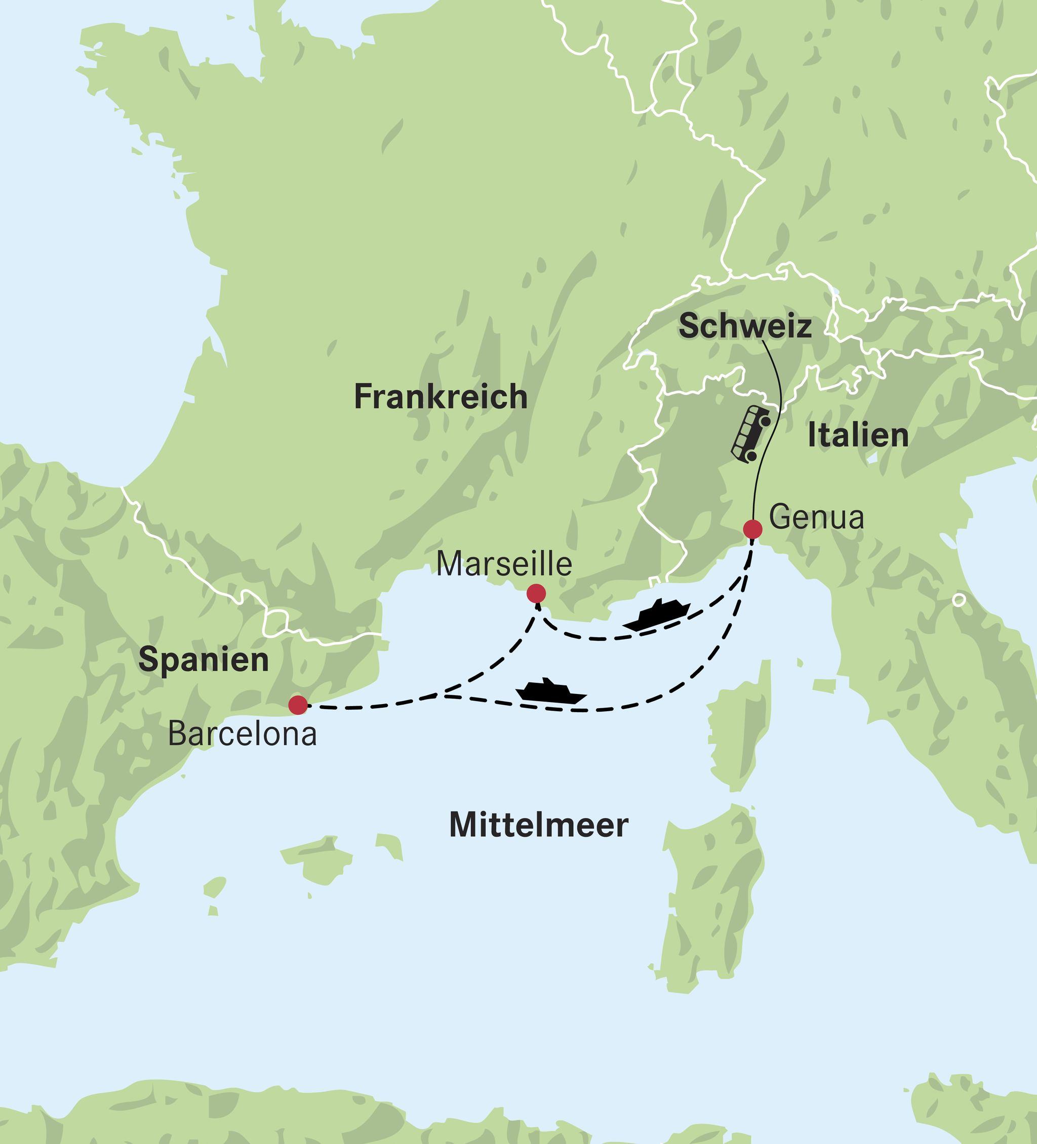 5. Tag: Genua - SchweizAm Morgen erreichen Sie wieder die italienische Stadt Genua. Rückreise in die Schweiz.